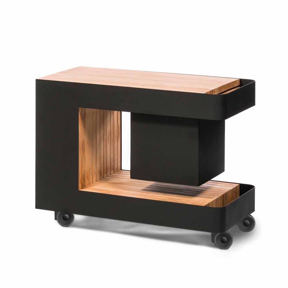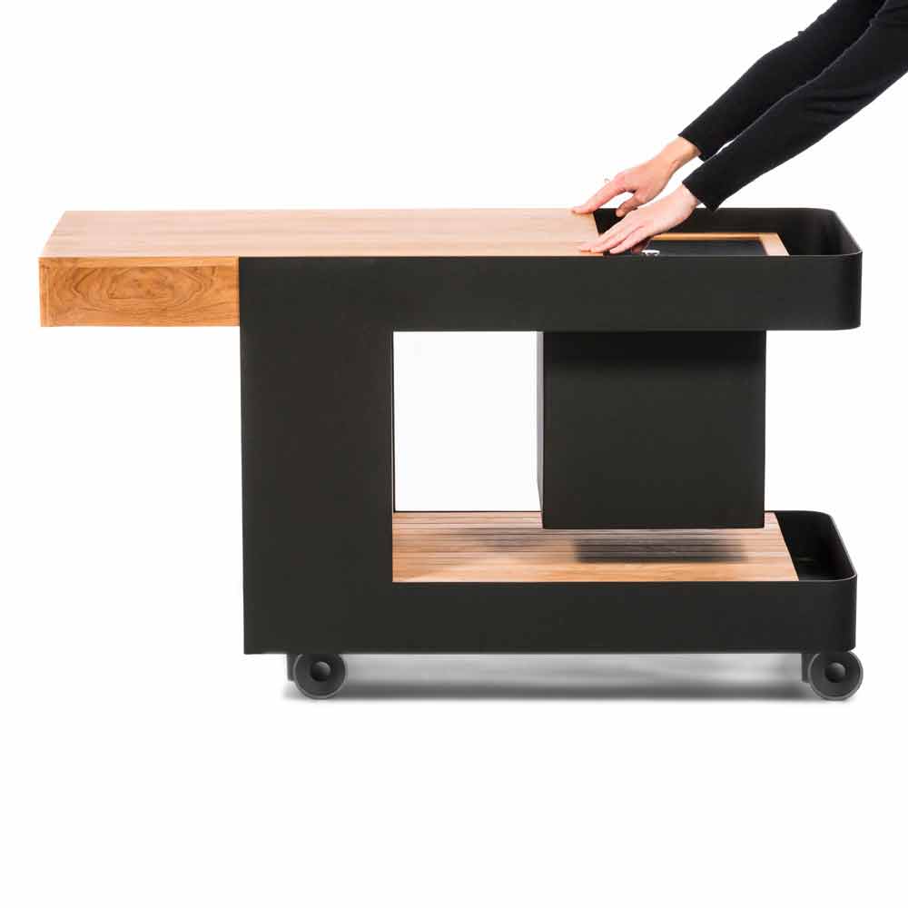 Mobile bar on wheels for outdoor with table, modern design, made of wood and steel, high quality.