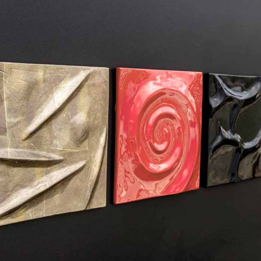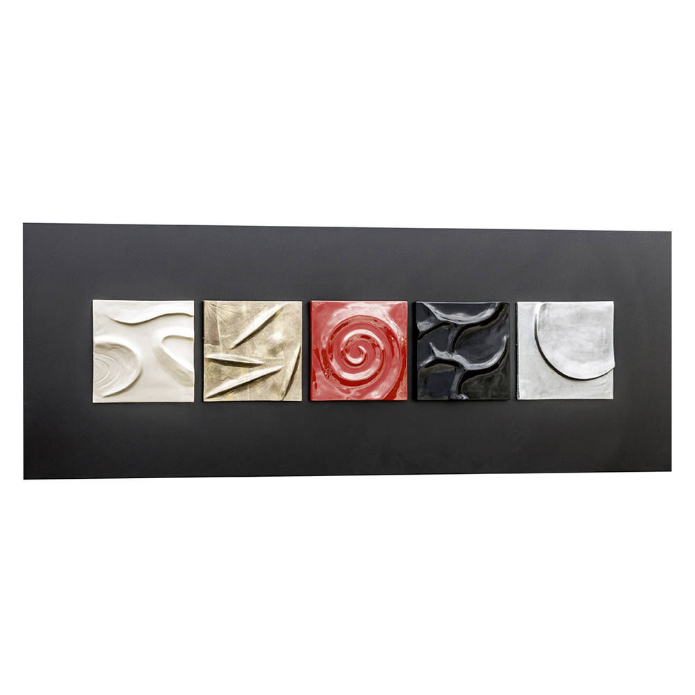 Moma comprises five elements in CMC, hand decorated with silver leaves and copper. Black structure on canvas, glossy finish.