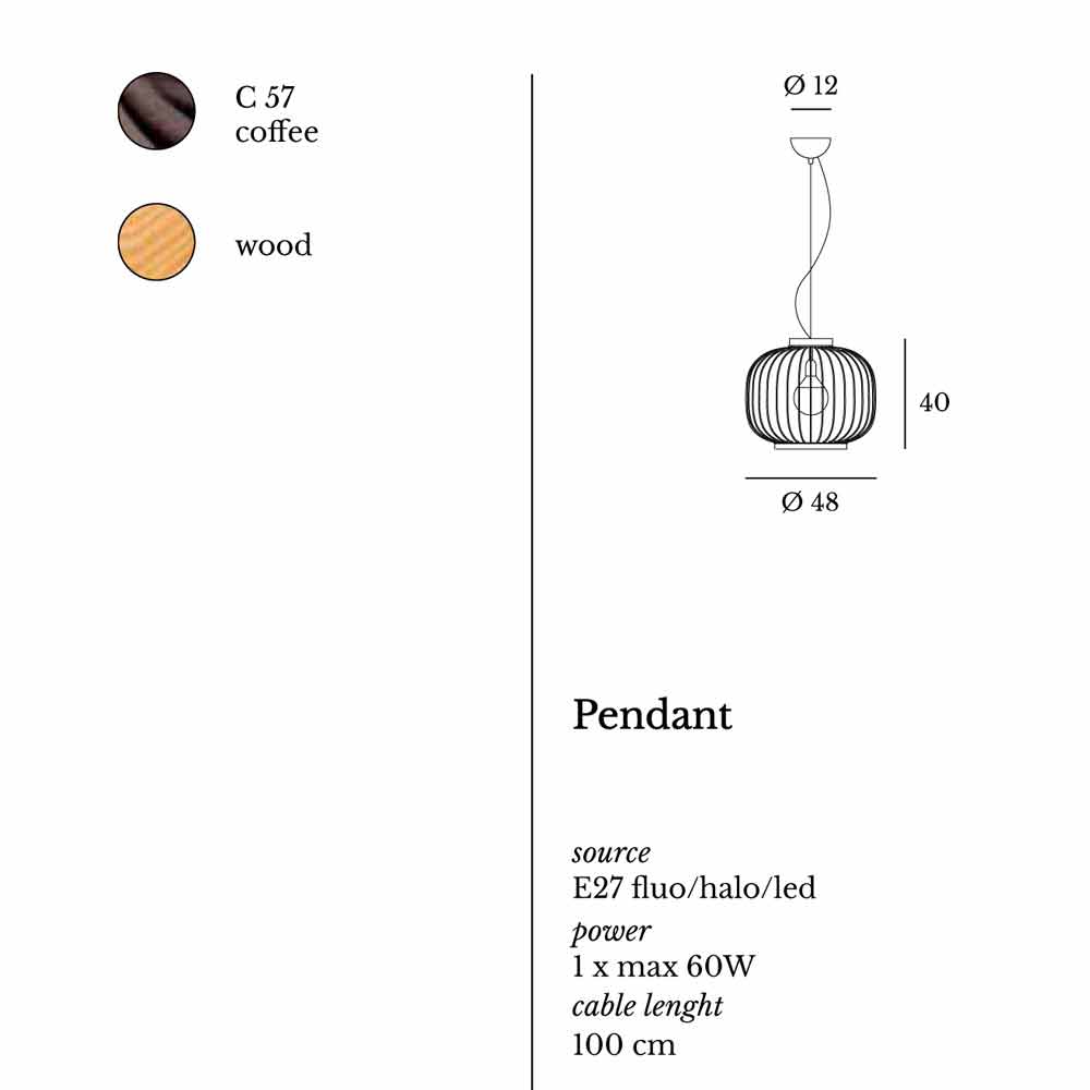 Suspension lamp made of shaped steel bar and painted with epoxy powders. The two bands that close the rounded body are made of natural wood.