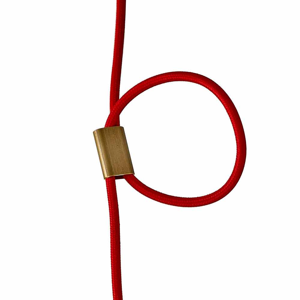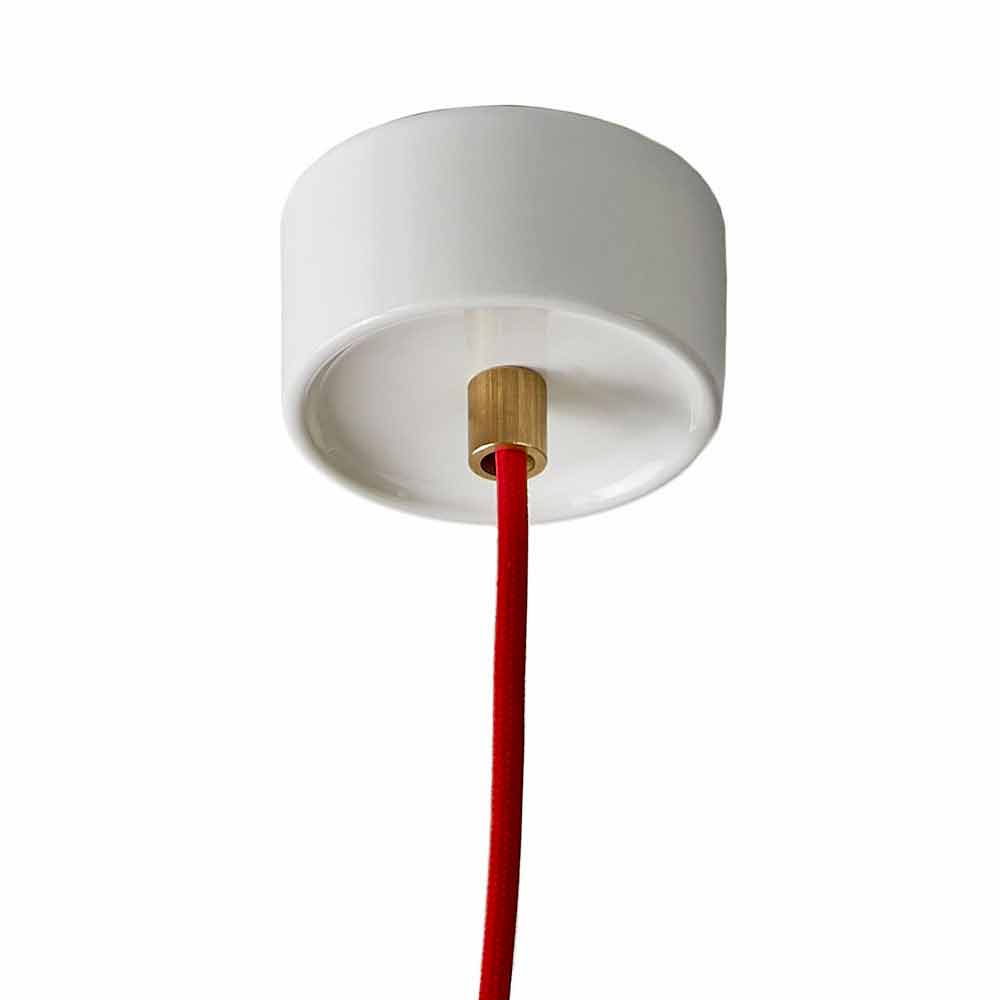 Colored suspension lamp in white ceramic and beech wood with red cloth cable and brass cable clamp.