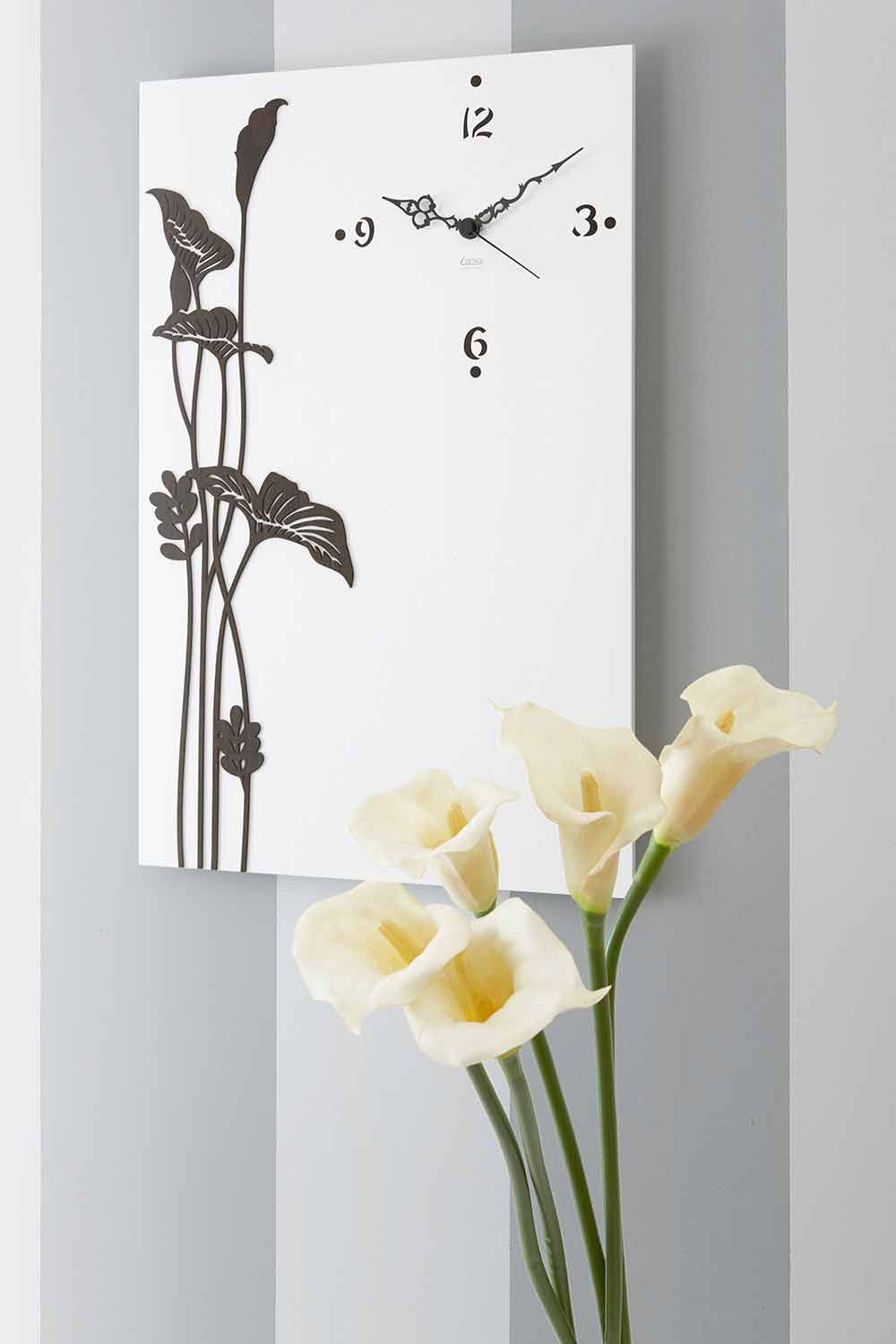White wall clock with decorations, modern wooden design made in Italy.