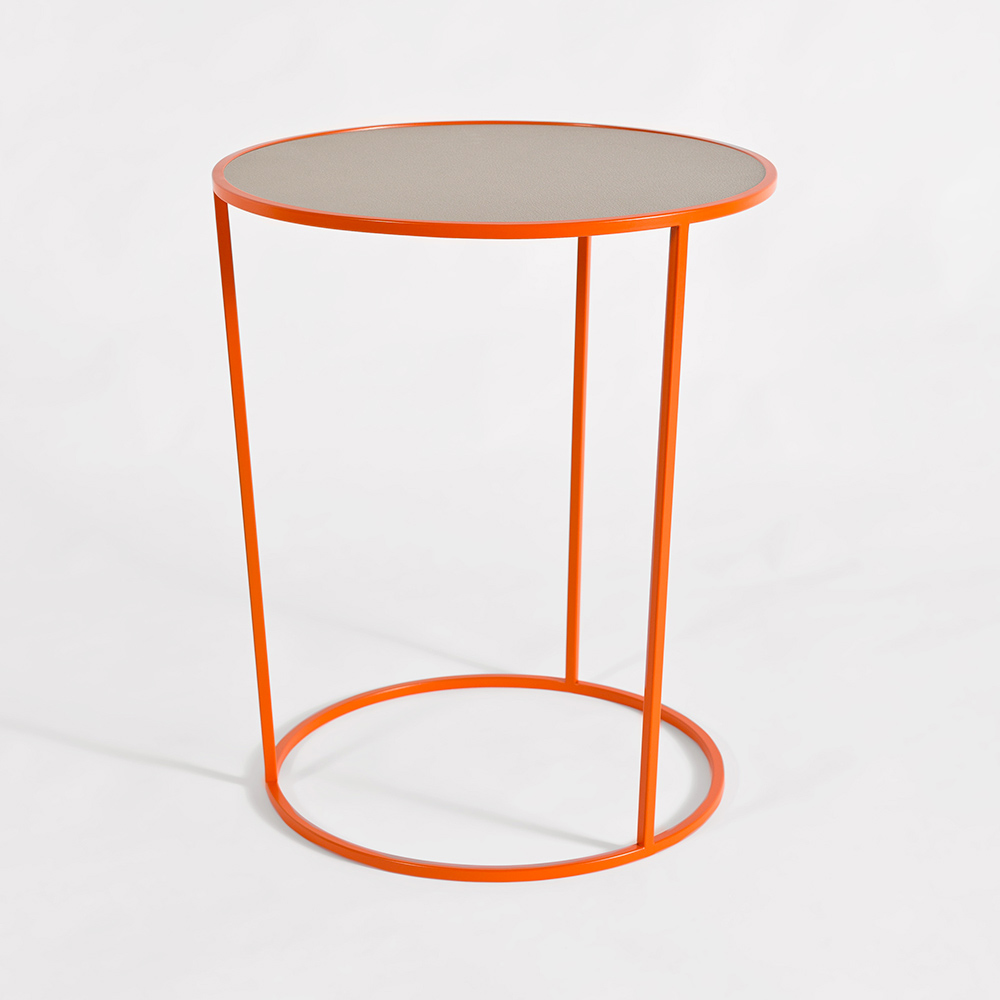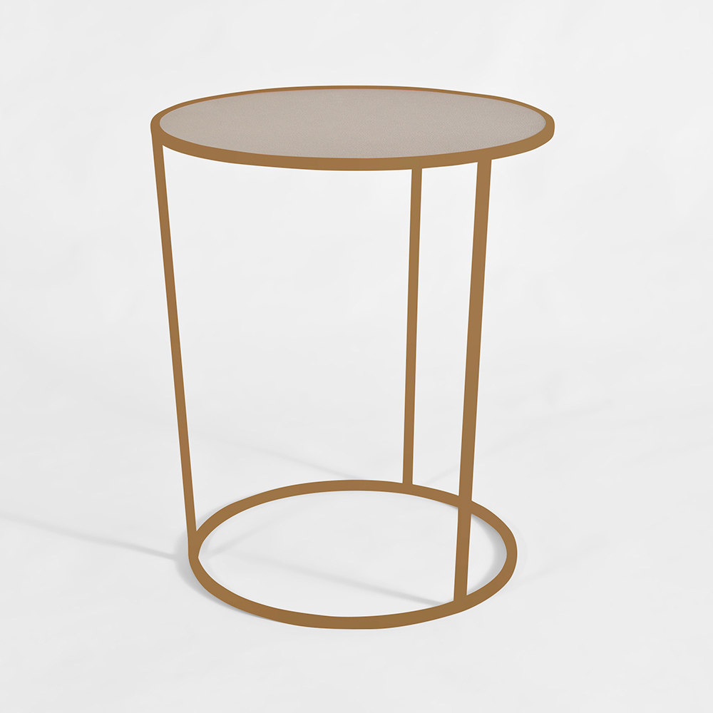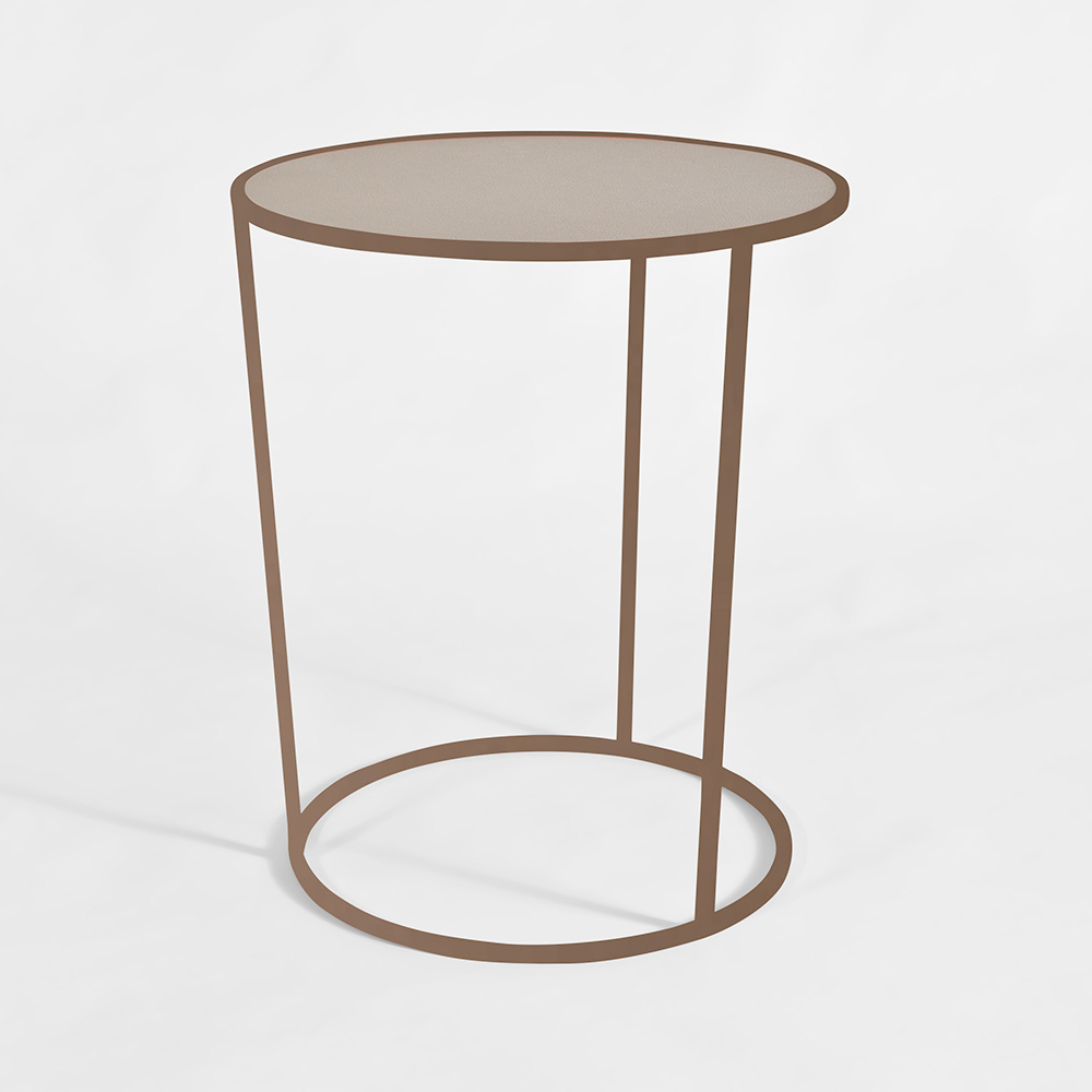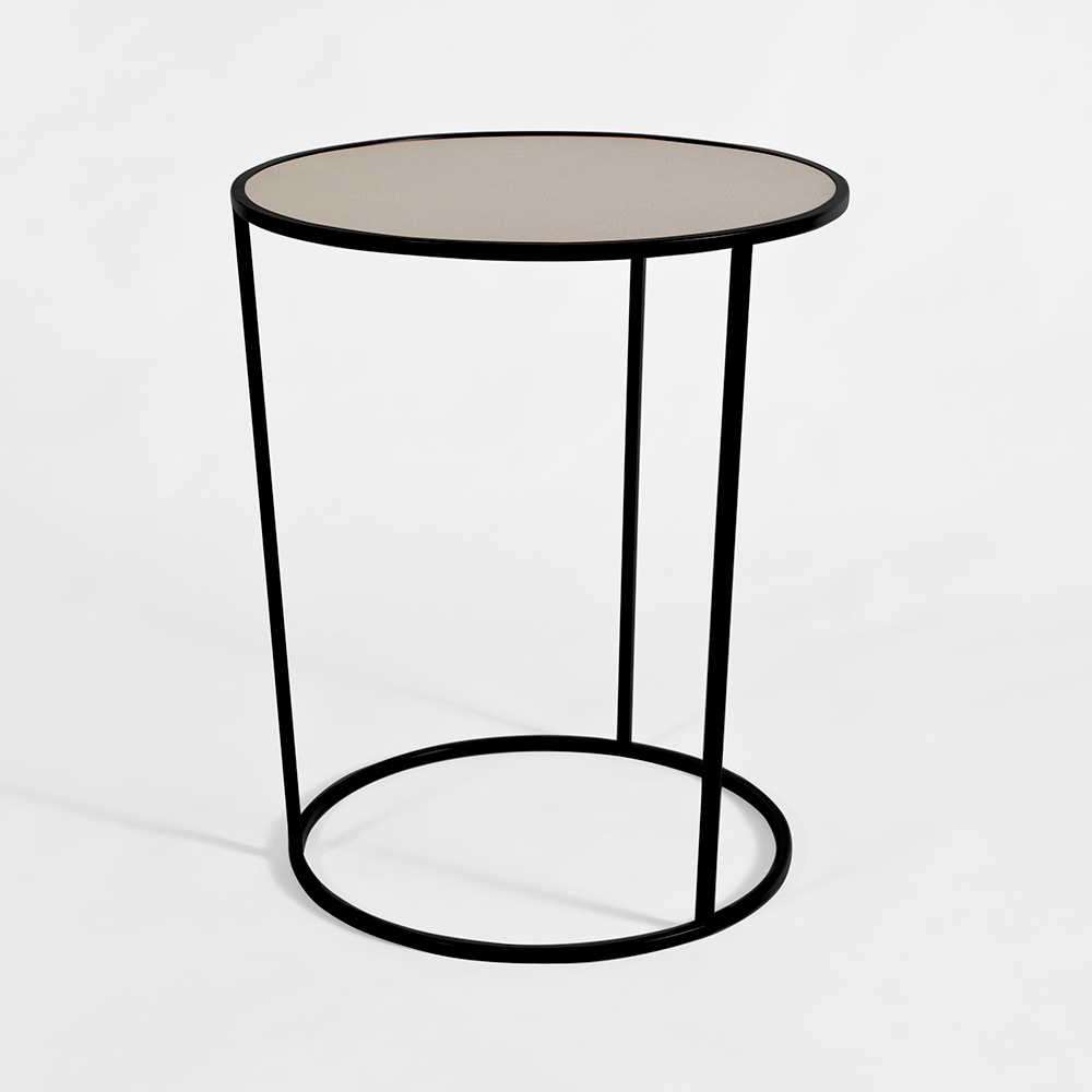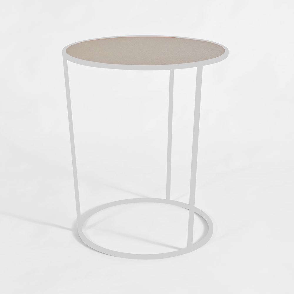 round coffee table with minimal lines and practical use has a top in grain leather melamine. The