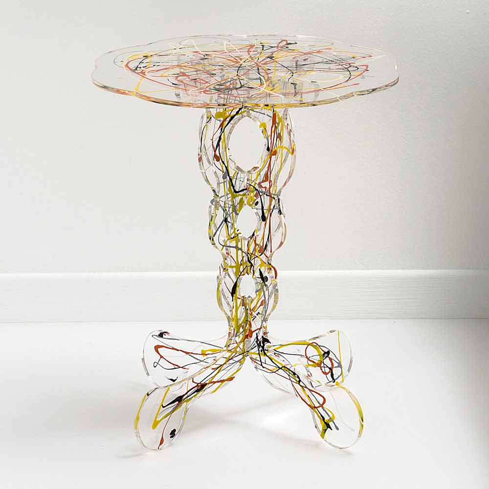 A moorish design characterises the Janis table, which can be used both as a coffee table or as a bedside table. The table base is made of laser-shaped 100% PMMA plexiglass. The table top gives a touch of color to the environment.