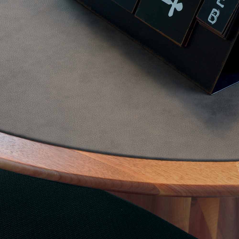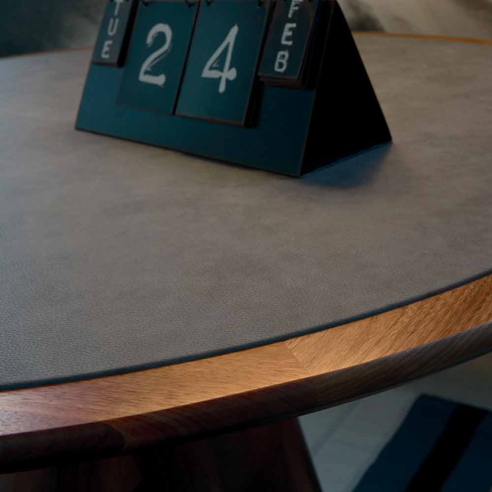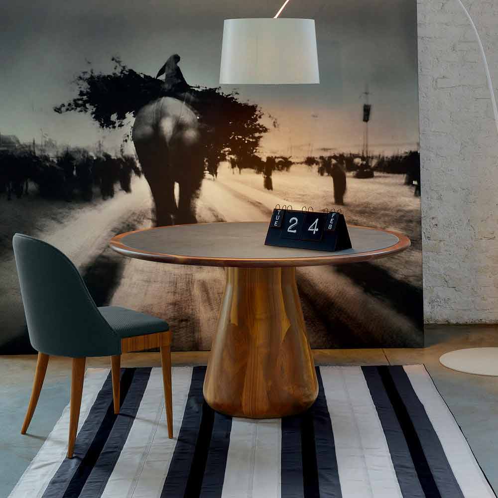 Fixed round table with solid walnut top. Base in solid turned Canaletto walnut. Carlo has clean features and lines that manage to enhance his value. Made of natural walnut and finished in oil, it shows the particular stylistic refinement with the shape of the base and the top covered in eco-leather.