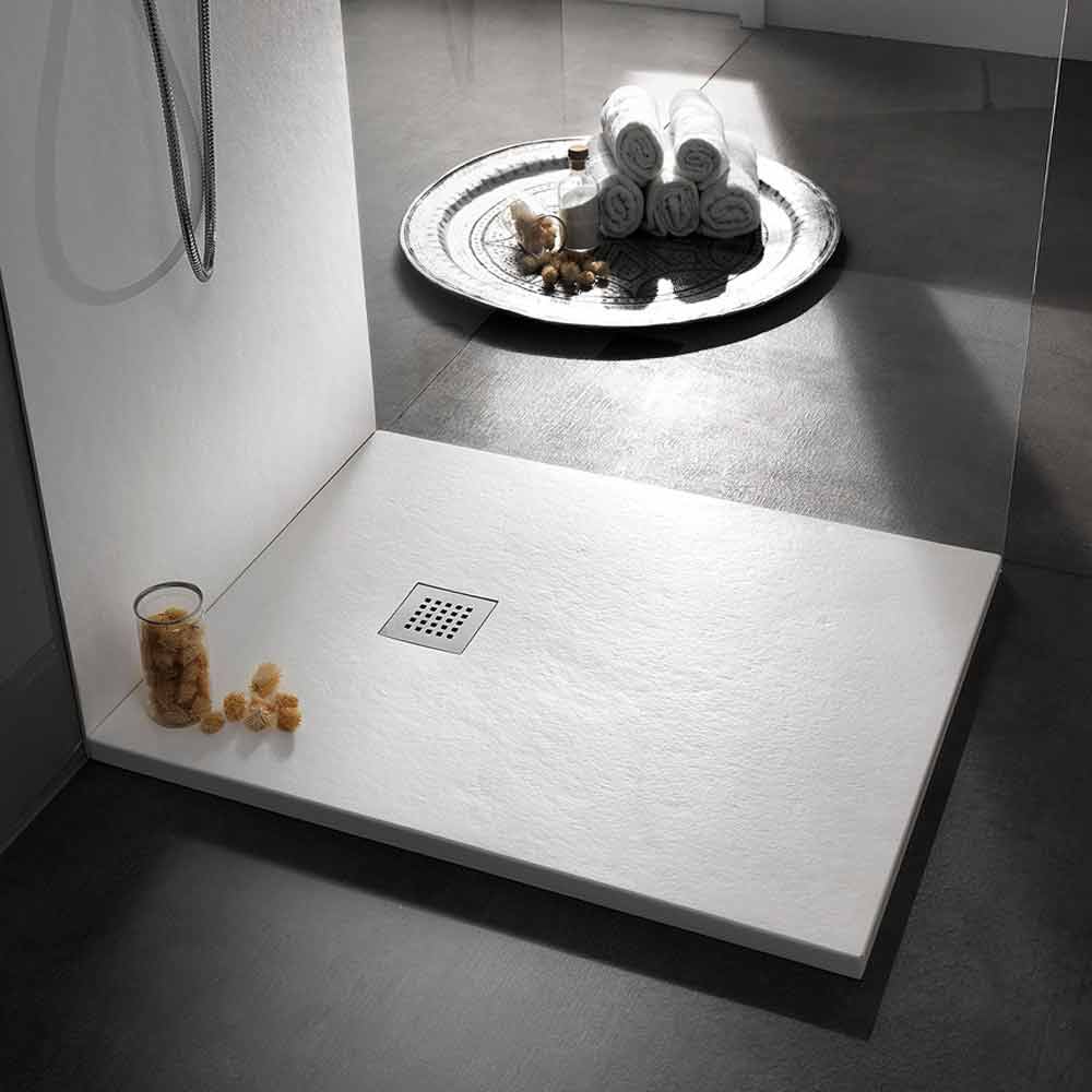 Square shower tray 90x90 in stone effect finish with steel grid.