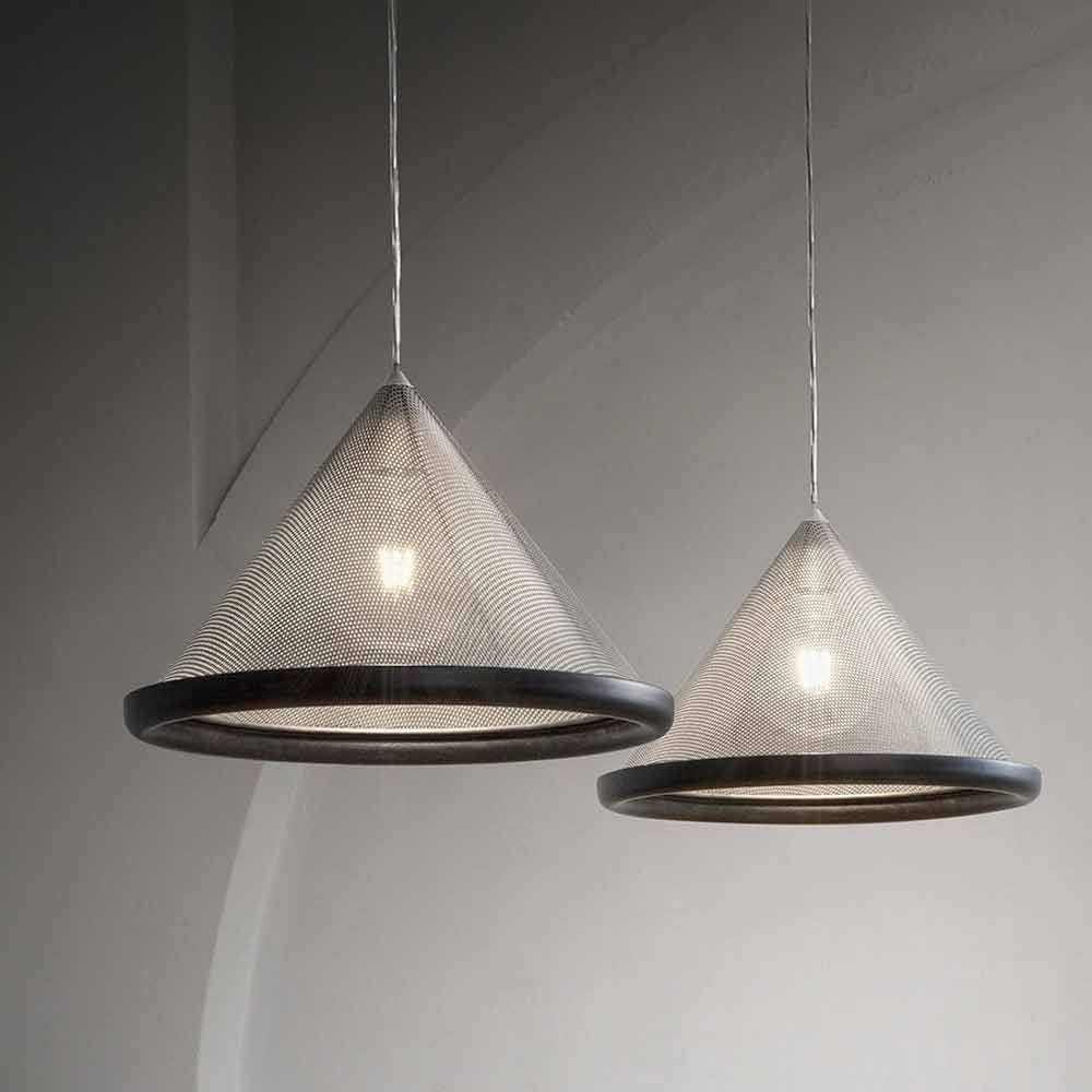 The body of the lamp is made of perforated stainless steel, the lower frame is made of ceramic gres. This item is offered in different colors and sizes.