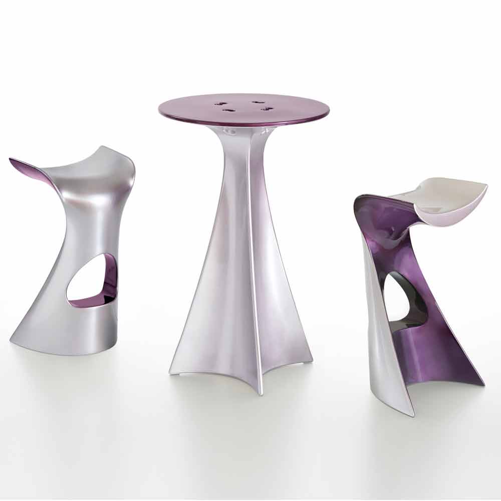 The JET NEXT high table has a modern and contemporary design. This product, designed by Karim Rashid , is the perfect partner for the iconic Koncord stool. To celebrate the tenth anniversary of the collaboration between Slide and the eclectic designer, a special two-tone metallic lacquered version is born. The silver base blends with the purple top. For furniture that leaves its mark, the Next Collection allows you to combine two different souls: a more visionary and futuristic one, given by the shapes of Jet and Koncord, and a more elegant and unique one, given by the special and almost iridescent lacquered color of the 'special edition.
