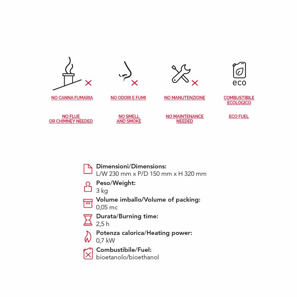 Griff 4 stainless steel bioethanol burner , with a heating power of 0,7 Kw.