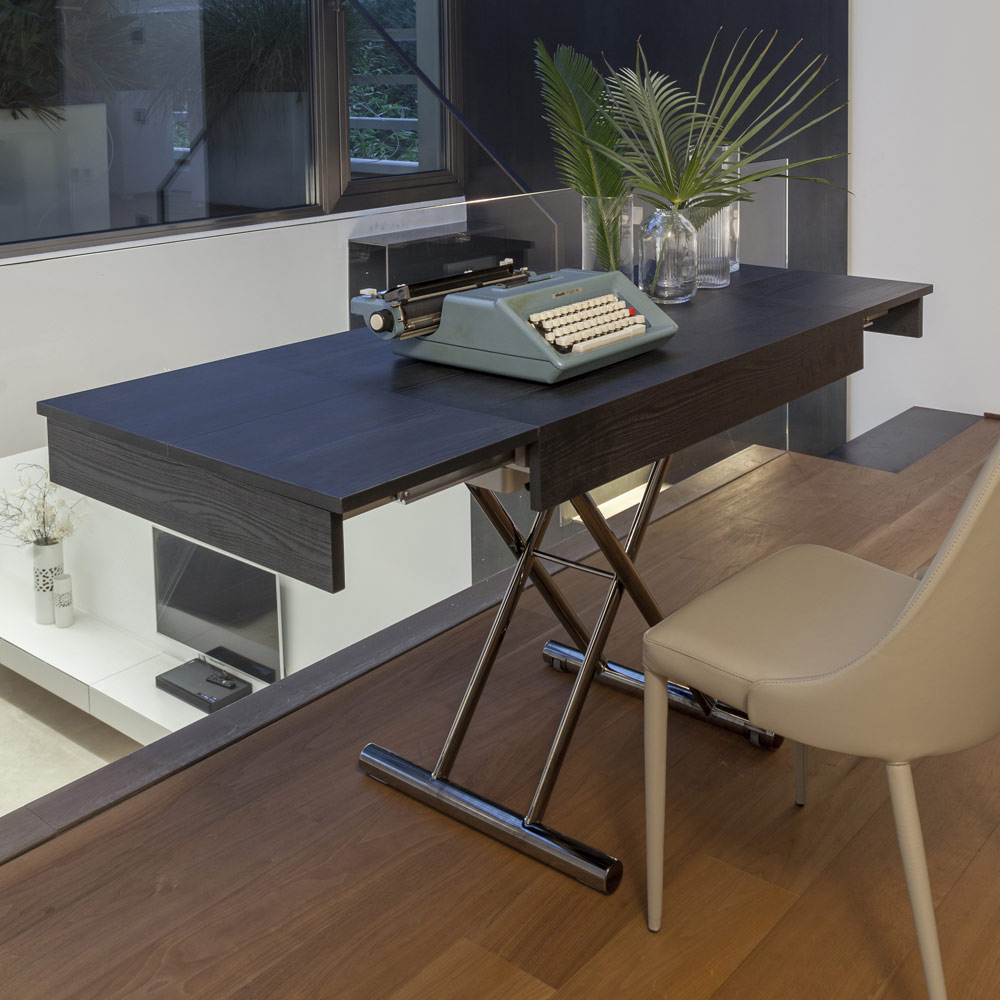 gas mechanism that allows you to adjust the height from 25 to 84 cm, creating a unique item with a strong personality. The table also has practical retractable wheels.