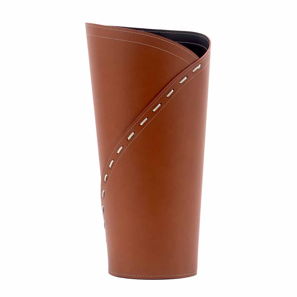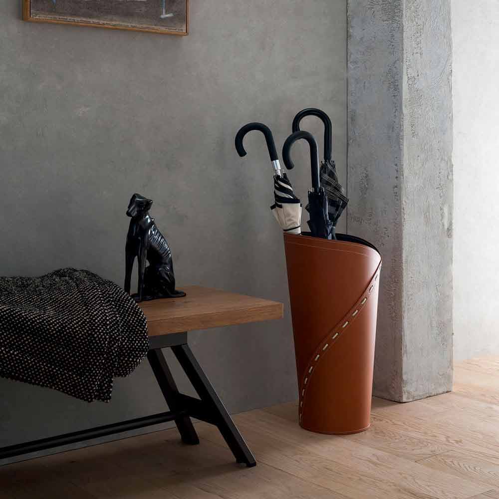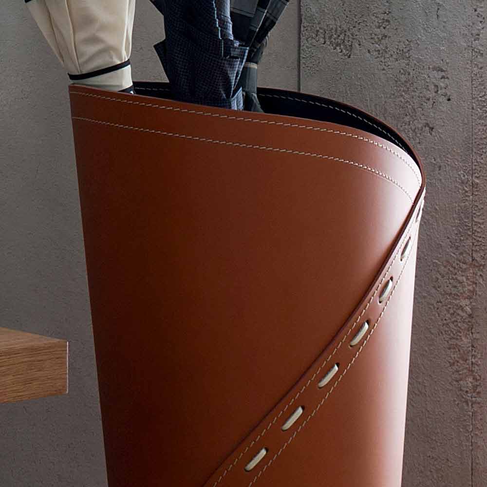 The Katrina umbrella stand is made of regenerated leather, which covers both the external and internal surfaces. The visible stitching is an elegant detail that contributes to giving a decorative value to a purely functional accessory.