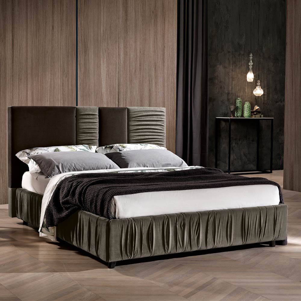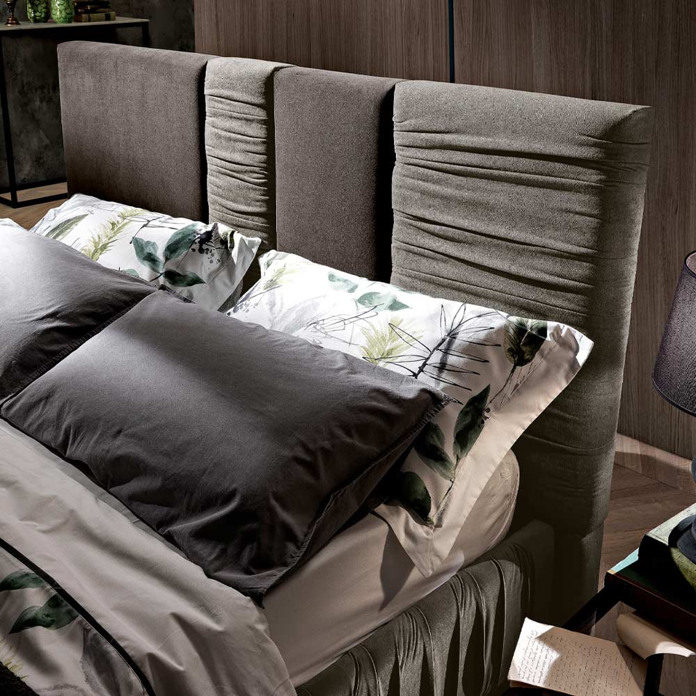 In this double bed the classic rectangular headboard separates into four vertical parts of different sizes, which alternate in the combination of different fabrics, creating an elegant tactile and visual harmony .