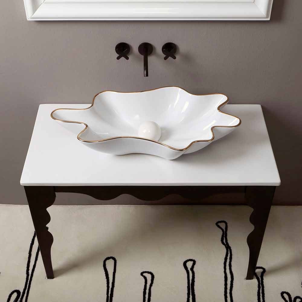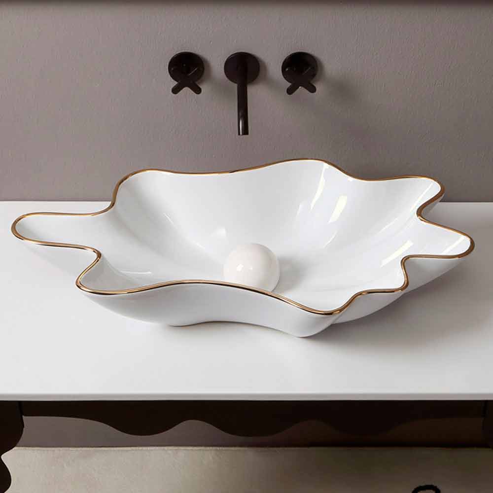 Modern white ceramic countertop basin Rayan gold edge, made in Italy