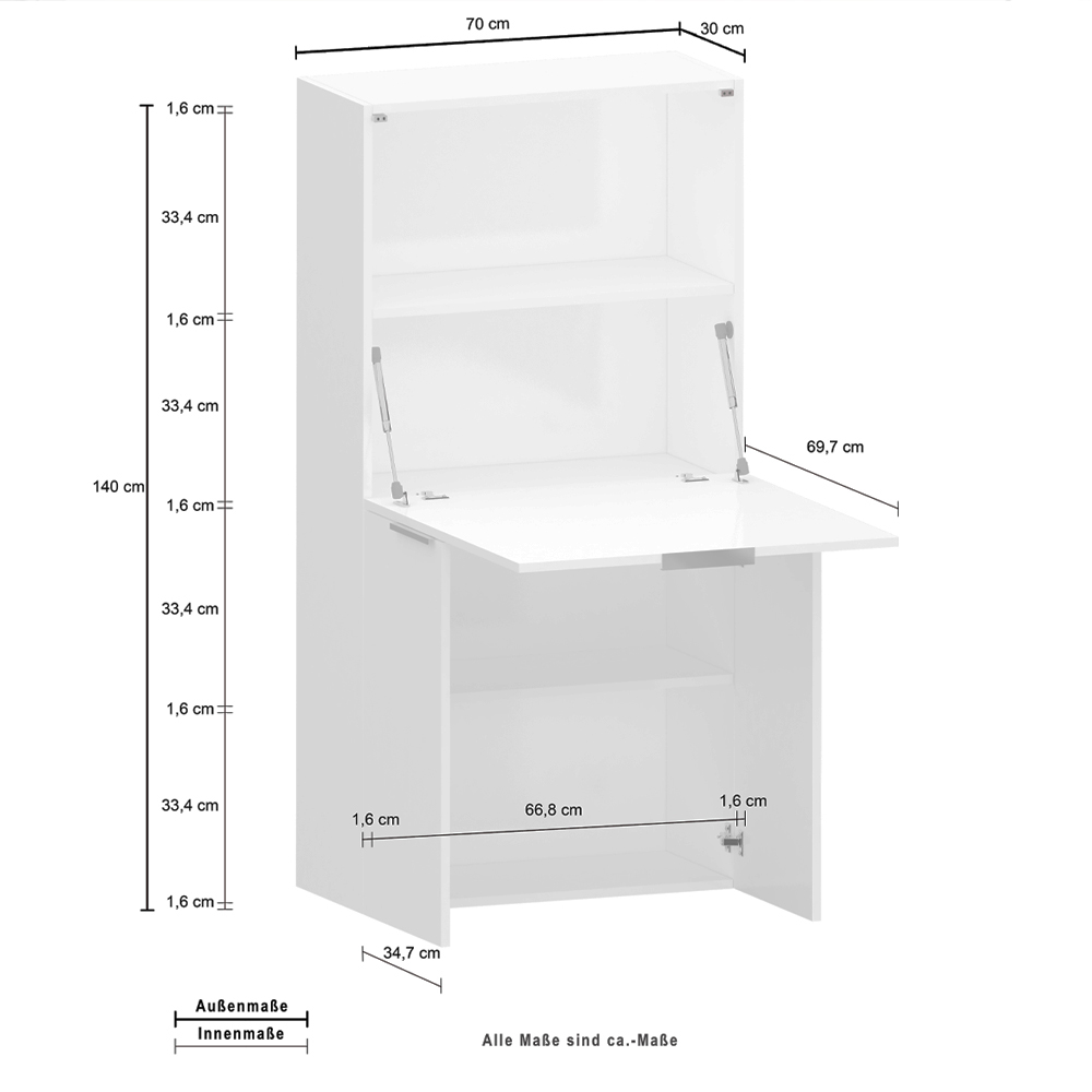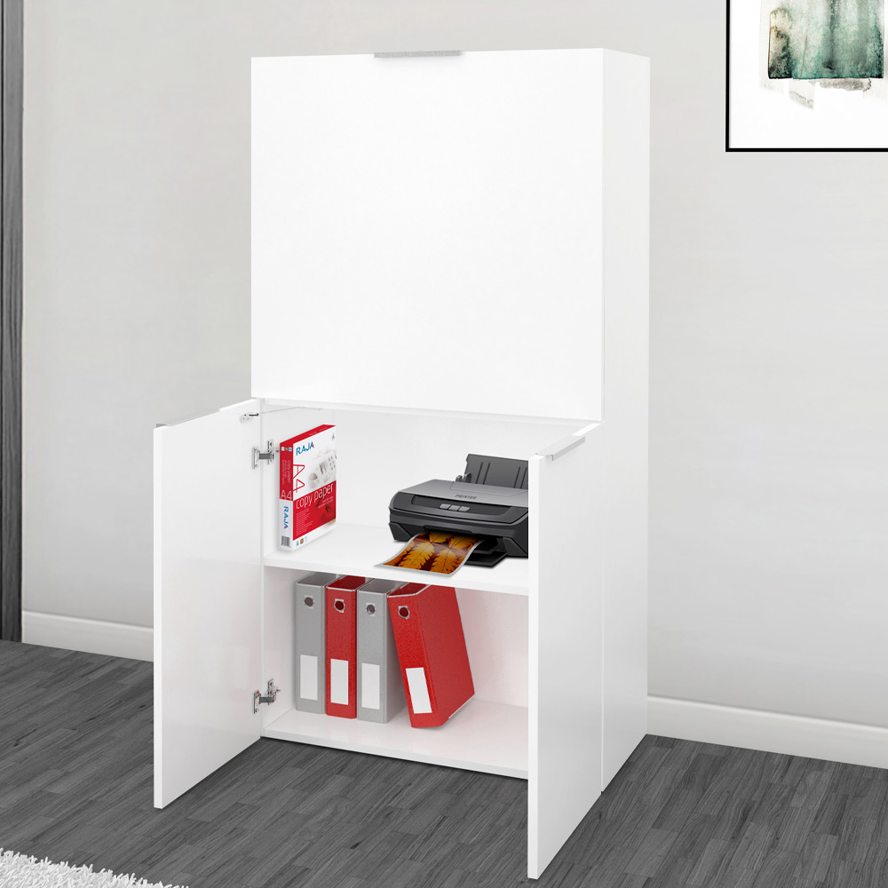 The structure consists of two lower hinged doors and an upper flap door which also acts as a desk top when opened downwards through the practical use of a handle.