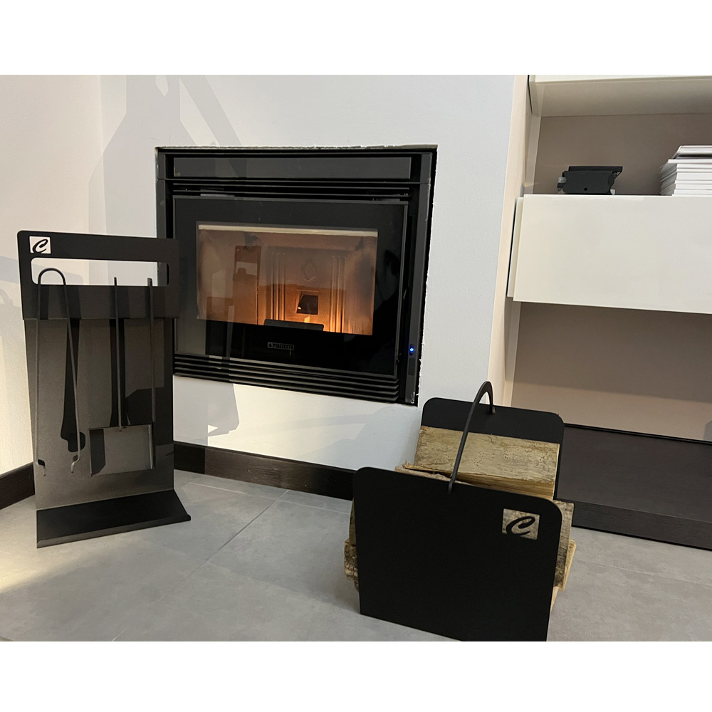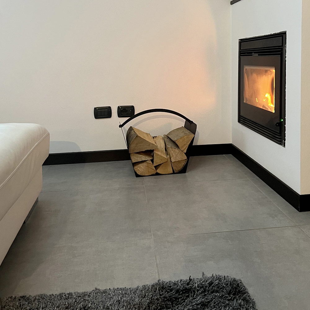 Portalegna for design fireplace made of non-toxic ality of powder-coated steel grades. Designed, designed and handcrafted in Italy, with the aim of highlighting not only the usefulness of the log holder itself, but also its aesthetic value, with its minimal design in the shape of a stylized basket.