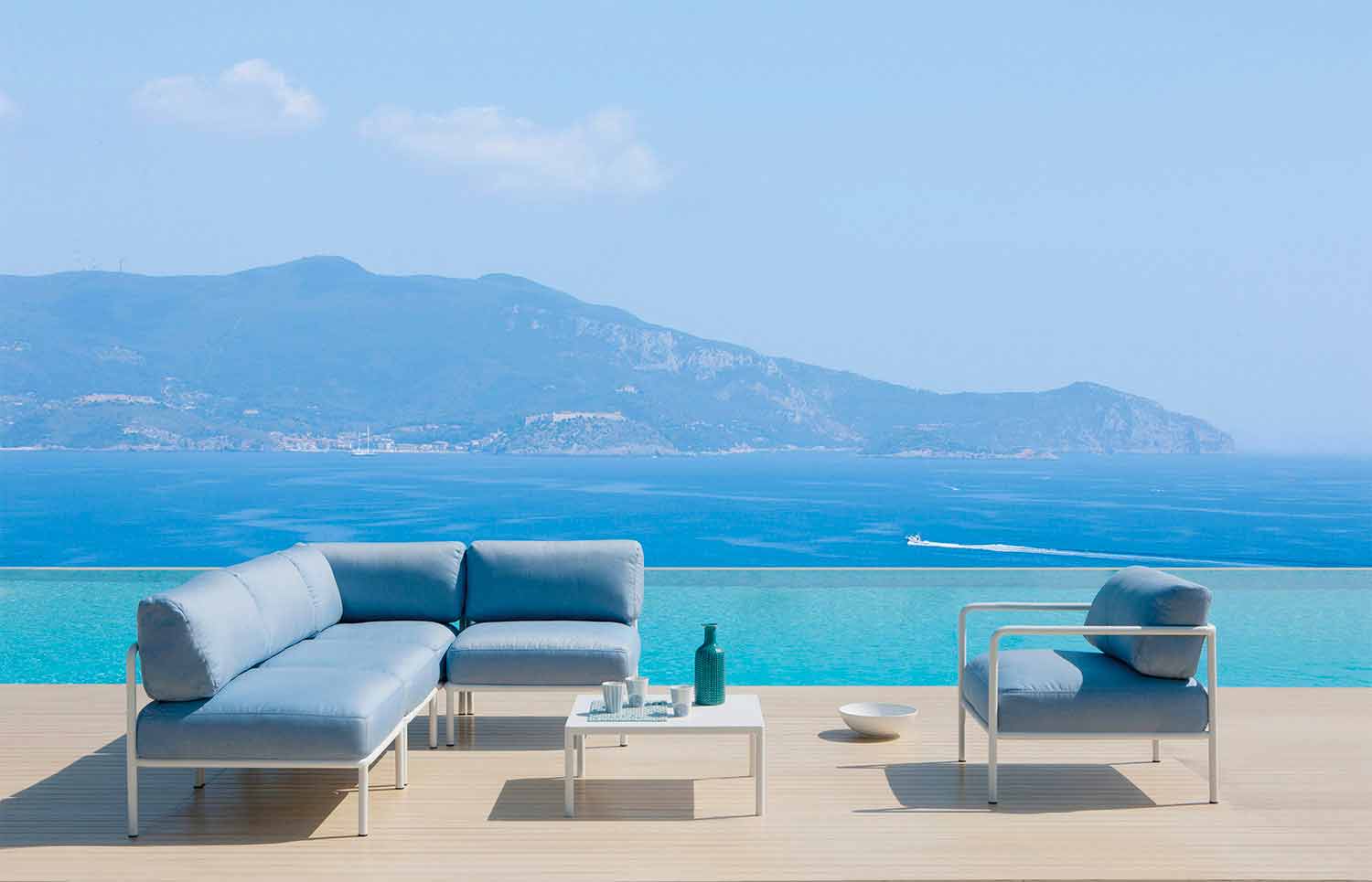 outdoor corner sofa made in Italy with high quality raw materials ideal for creating elegant living room compositions together with the other elements of the collection. Thanks to its minimal but refined design and the available colors, it is versatile and therefore adaptable to different types of environments focusing attention on the essentiality of the lines.