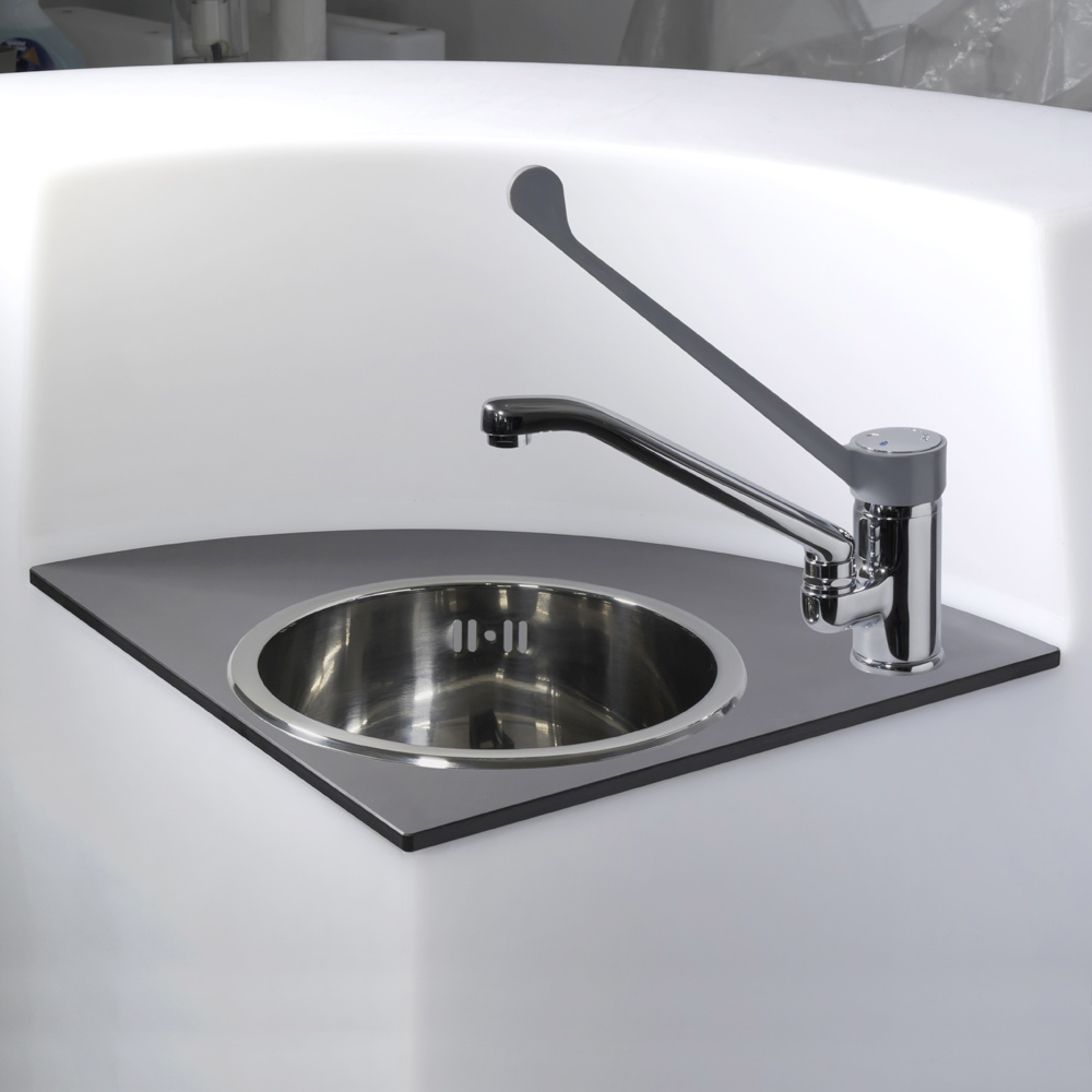handwashing kit is composed of a pre-drilled anthracite-coloured HPL top, mixer, sink and drainage system.