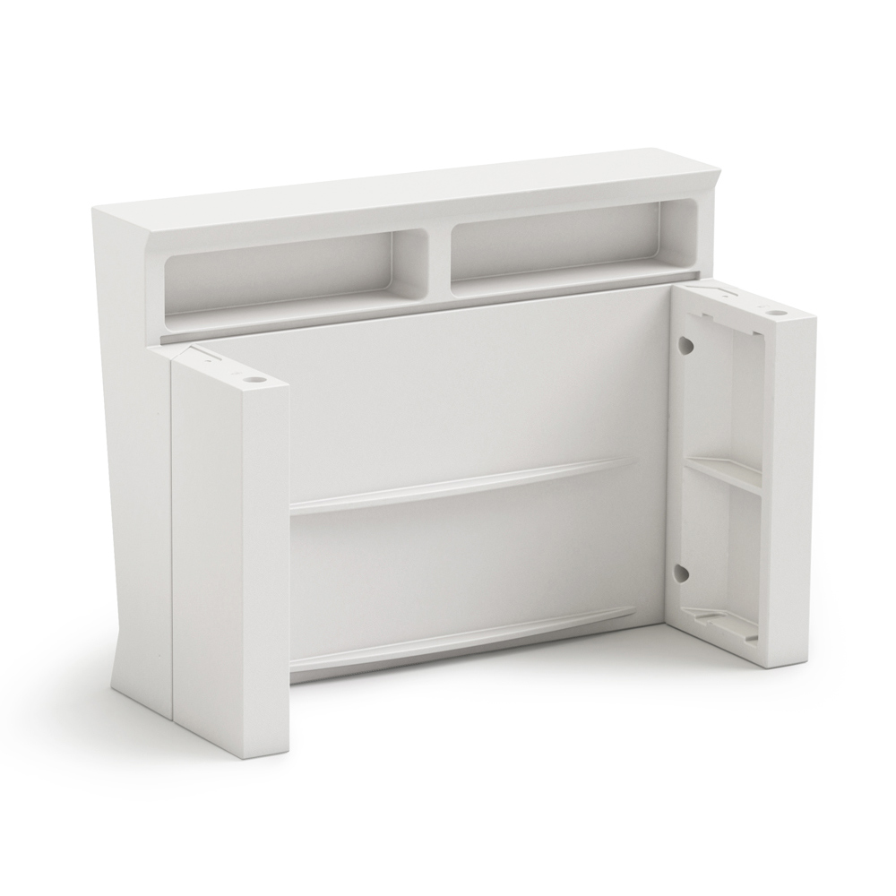 - Corner counter with RGBW LEDs with anthracite-coloured HPL shelves