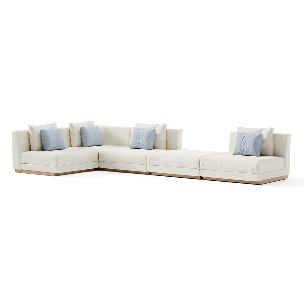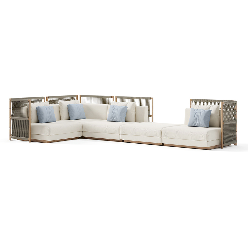 Modular garden sofa entirely made in Italy with seat and back cushions in upholstered fabric. The product consists of a low and deep seat and thanks to the large cushions it becomes an inviting and welcoming system designed to create a relaxed and informal atmosphere. This sofa is perfect for making any environment unique, offering the freedom to rewrite your living spaces with taste and style. Thanks to its simple and linear finishes, it guarantees elegance and refinement to any environment in which it is placed. The variant with the structure in iroko wood and green rope weaves , thanks to its decoration, recalls the artisan tradition of weaving and gives a touch of unique identity to the composition while remaining a purely decorative element. This structure can also be used as a freestanding partition boiserie.