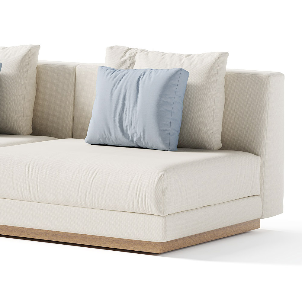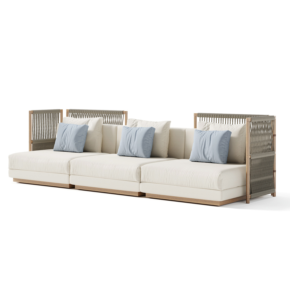 Modular garden sofa entirely made in Italy with seat and back cushions in upholstered fabric. The product consists of a low and deep seat and thanks to the large cushions it becomes an inviting and welcoming system designed to create a relaxed and informal atmosphere. This sofa is perfect for making any environment unique, offering the freedom to rewrite your living spaces with taste and style. Thanks to its simple and linear finishes, it guarantees elegance and refinement to any environment in which it is placed. The variant with the structure in iroko wood and green rope weaves , thanks to its decoration, recalls the artisan tradition of weaving and gives a touch of unique identity to the composition while remaining a purely decorative element. This structure can also be used as a freestanding partition boiserie.
