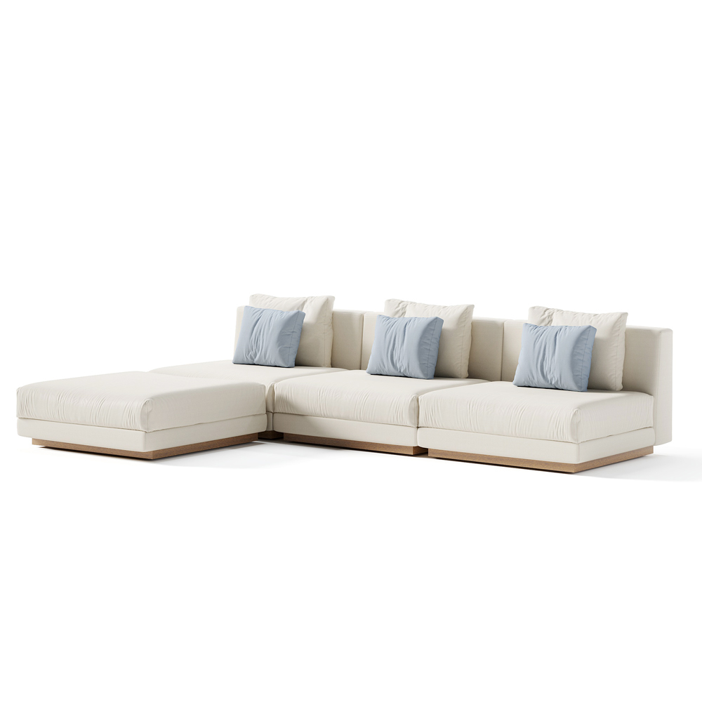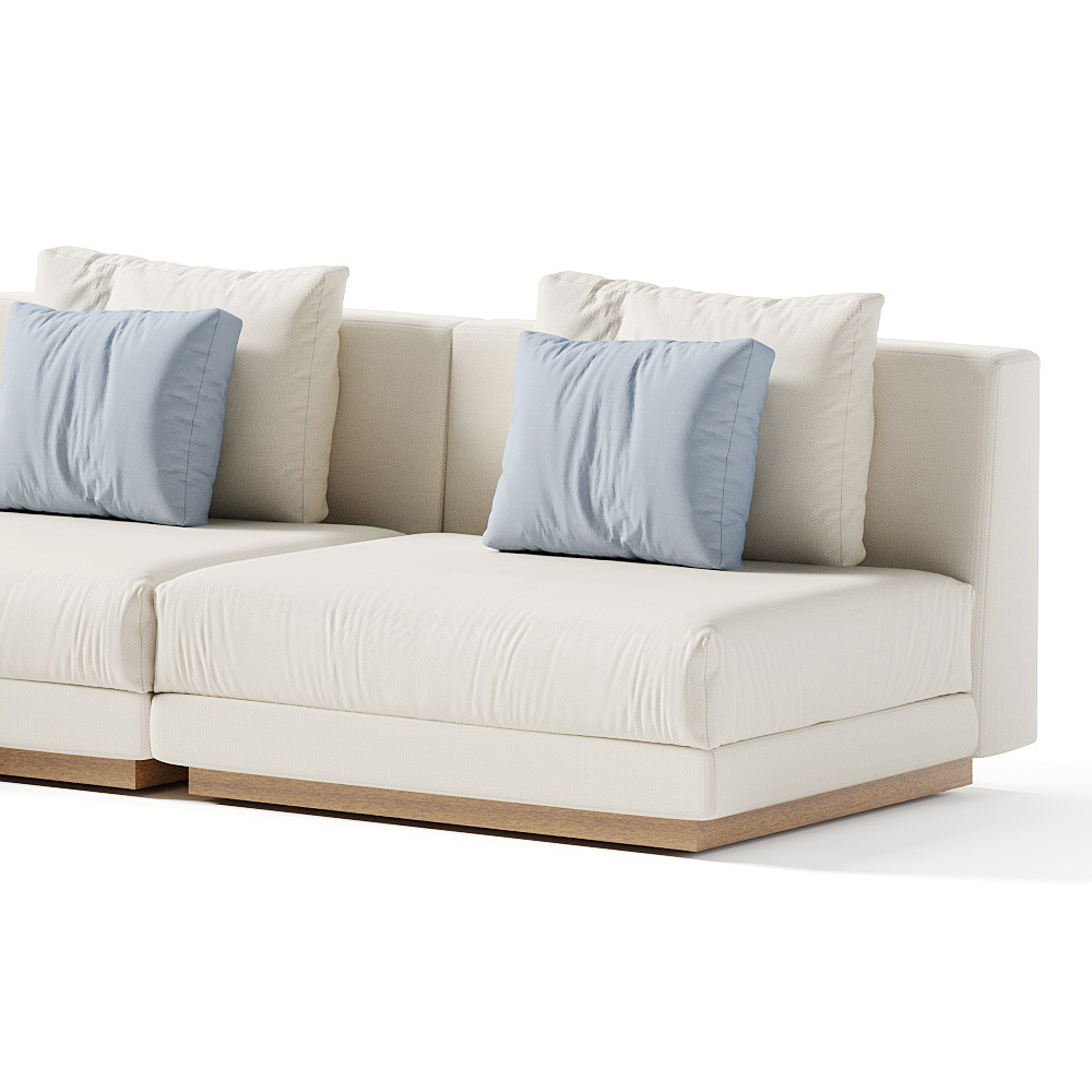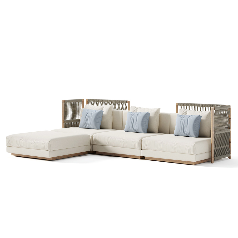 Modular garden sofa entirely made in Italy with seat and back cushions in padded fabric. The product is composed of a low and deep seat and thanks to the large cushions it becomes an inviting and welcoming system designed to create a relaxed and informal atmosphere. This sofa is perfect for making any environment unique, offering the freedom to rewrite your living spaces with taste and style. Thanks to its simple and linear finishes, it guarantees elegance and refinement to any environment in which it is placed. The variant with the iroko wood structure and green rope weaves , thanks to its decoration, recalls the artisan tradition of weaving and gives a touch of unique identity to the composition while remaining a merely decorative element. This structure can also be used as a freestanding dividing boiserie.