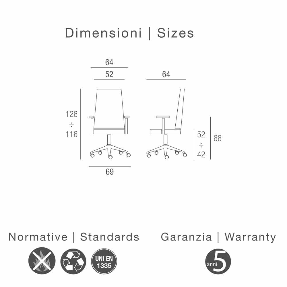 Measures Total lenght 69cm x L.seat 52 cm x H.tot 126/116cm x h. seat 52/42cm x h. armrests 66cm
