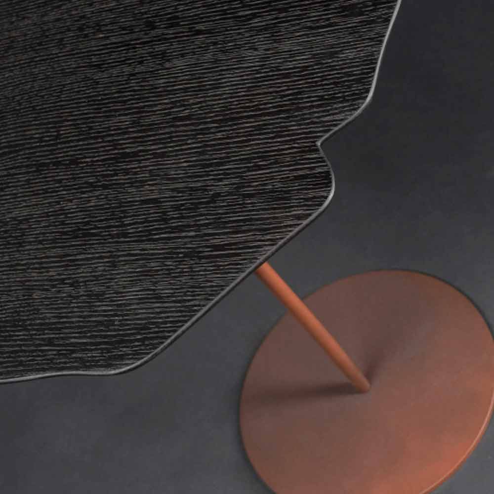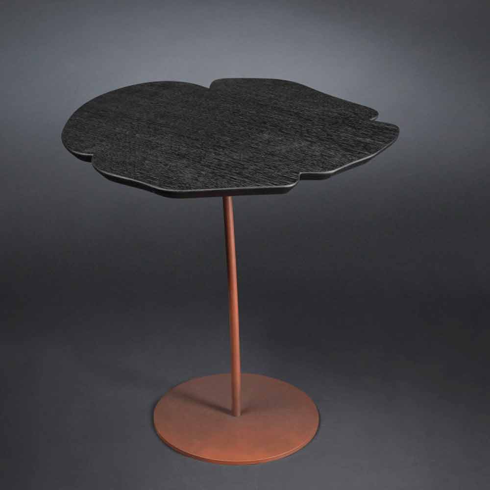 Andy is a sturdy coffee table, characterised by an original and modern design. Flower-shaped brushed oak table top in the colour moka, open pore finish. Metal frame in the Corten colour.