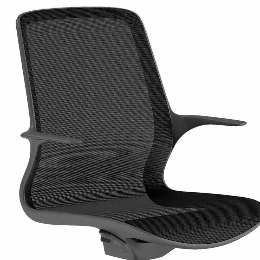 Office swivel chair with fixed armrests covered in black mesh, black nylon structure.