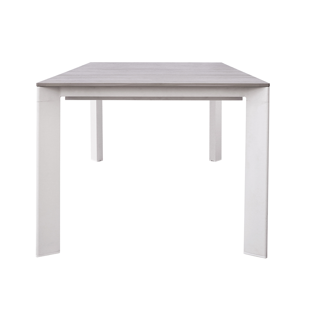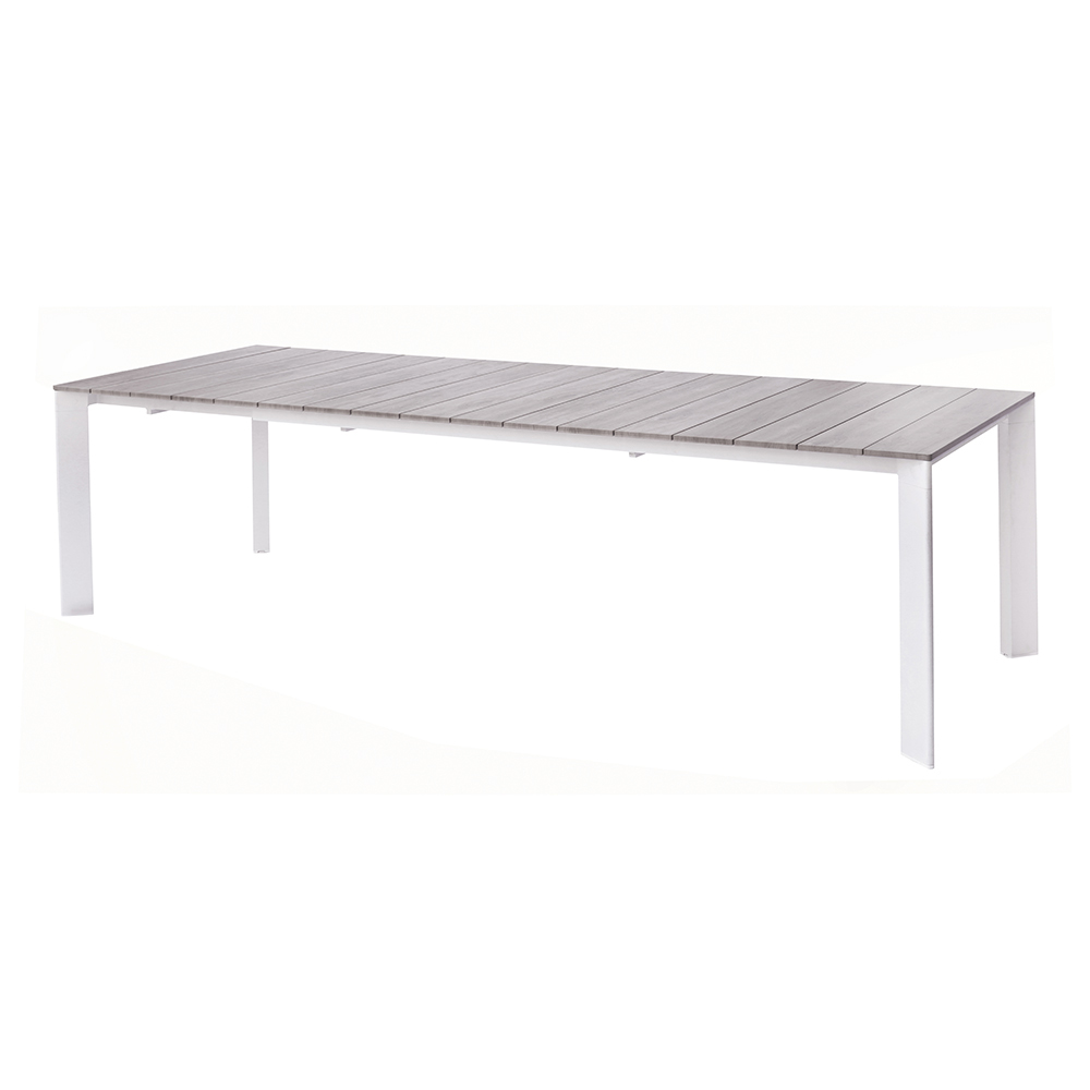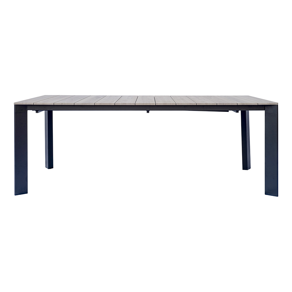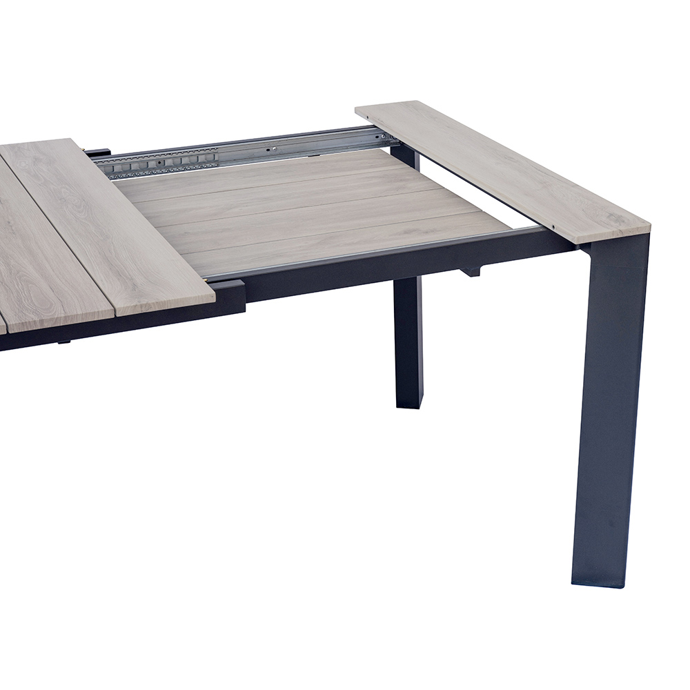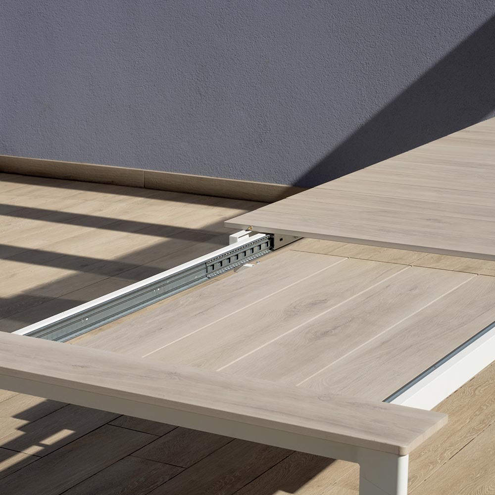 The wood-effect aluminum top combines the aesthetic warmth of natural wood with the durability of aluminum, ensuring an elegant, durable, and easy-to-maintain surface. The extension system with sliding aluminum legs allows the table to be extended easily and smoothly, while maintaining maximum stability and a harmonious look.