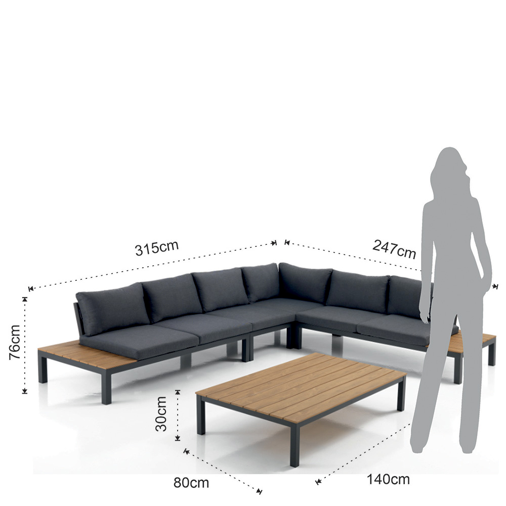 This corner sofa with coffee table for the garden is the example of modern outdoor luxury . The combination of sturdy aluminum structures and the use of polywood for the details of the coffee table and sofa ends creates an elegant and sophisticated visual contrast. The thick, comfortable cushions provide an inviting and relaxing seating experience, perfect for long afternoons of leisure or evenings of socializing under the stars.