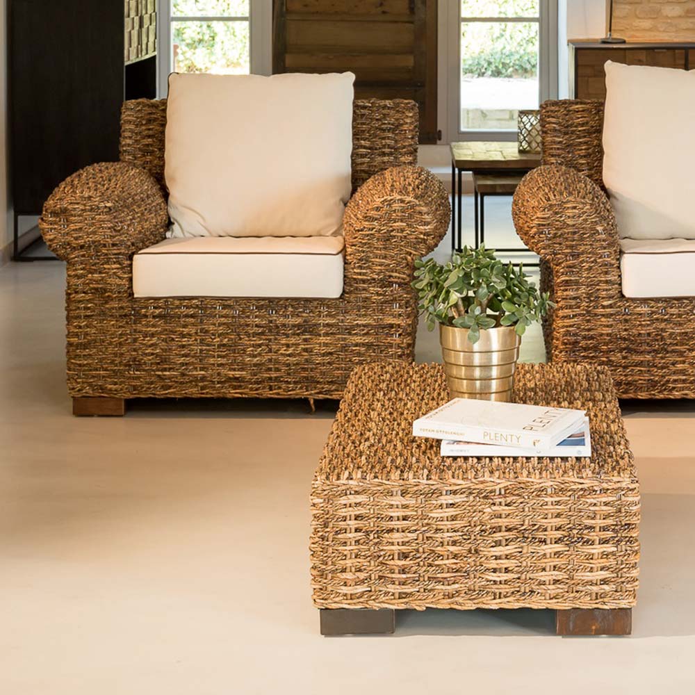 The armchair belongs to a whole collection which is made unique by the rounded cylindrical armrests and a refined dense weave of natural abaca fibre, derived from the banana tree . The seats are large and equipped with comfortable cushions .