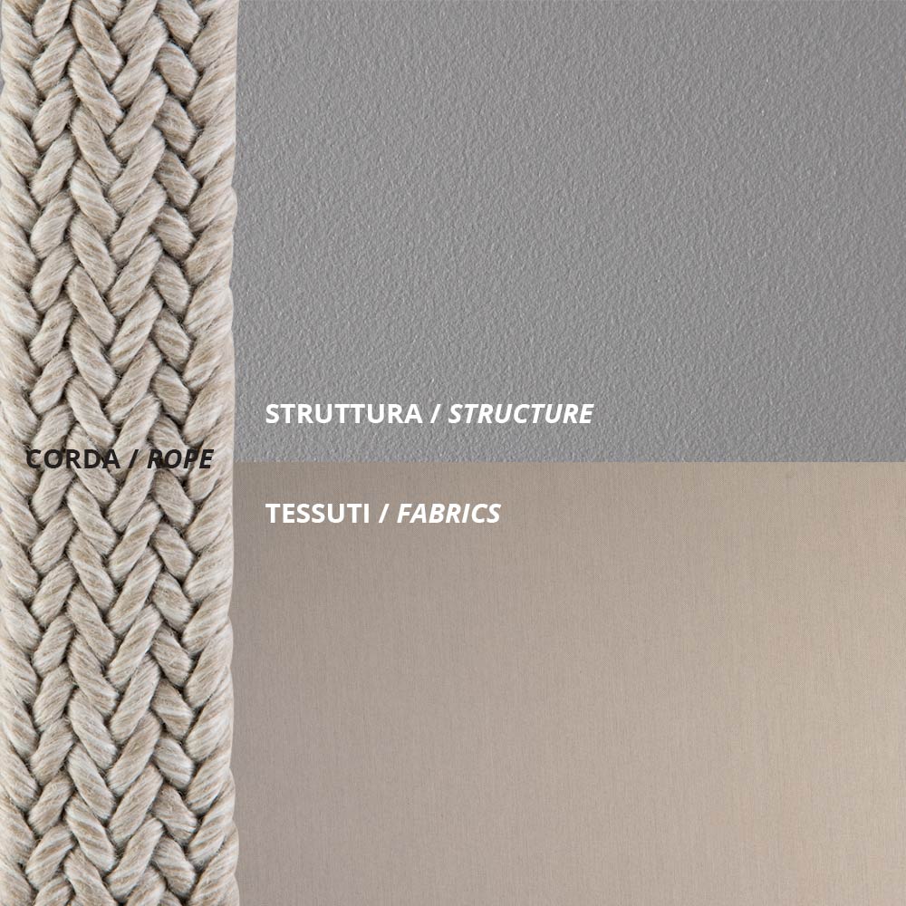 resistance of the material finish to corrosive atmospheric agents while the rope is resistant to chlorine and solar rays as well as anti-mold. The cushions are made of material resistant to UV rays and water maintaining the color for a long time.