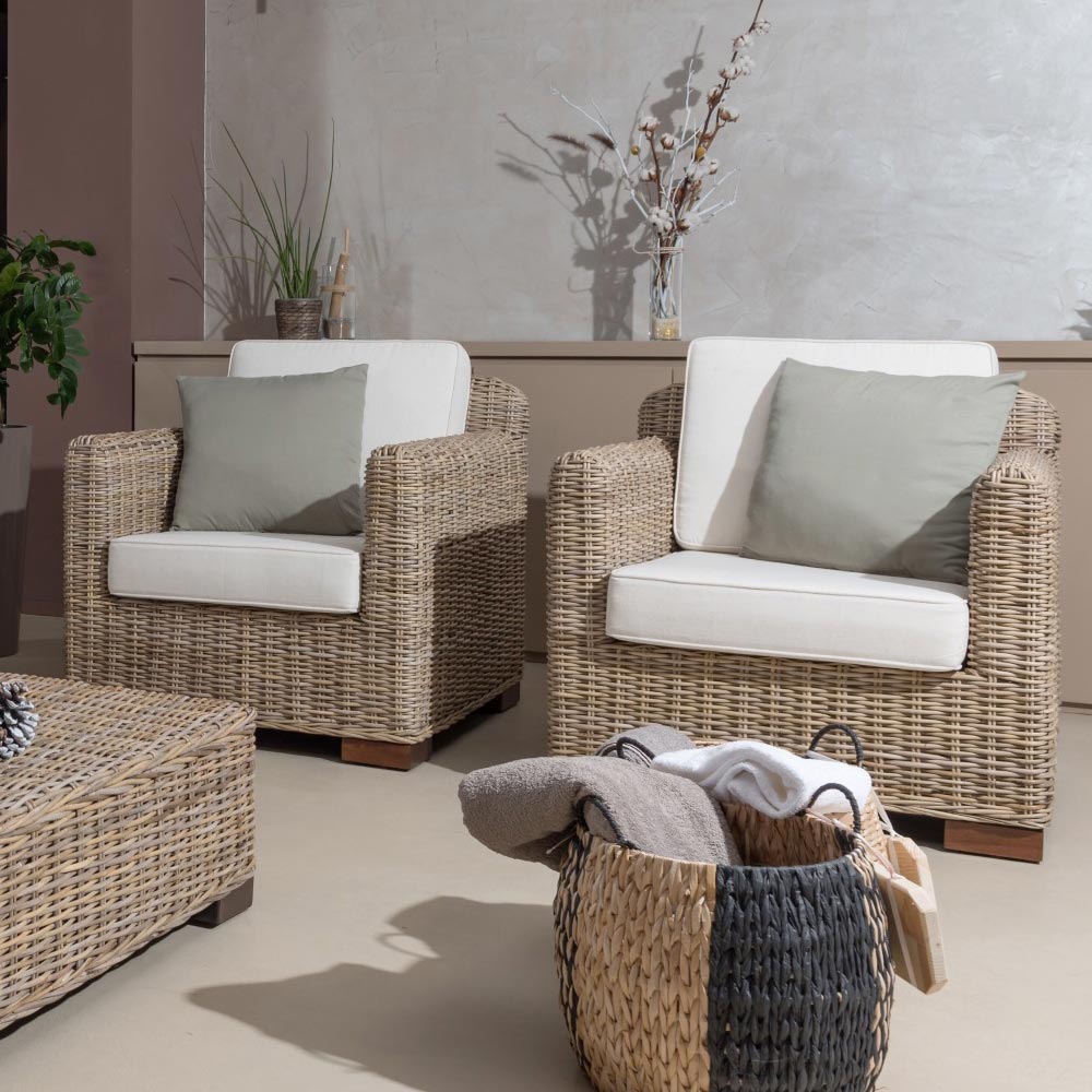 The armchair belongs to a whole collection characterized by the natural gray kubu with straight lines and a wide seat. Comfort and essentiality in a timeless style that takes shape thanks to the use of natural fibers that nature provides.