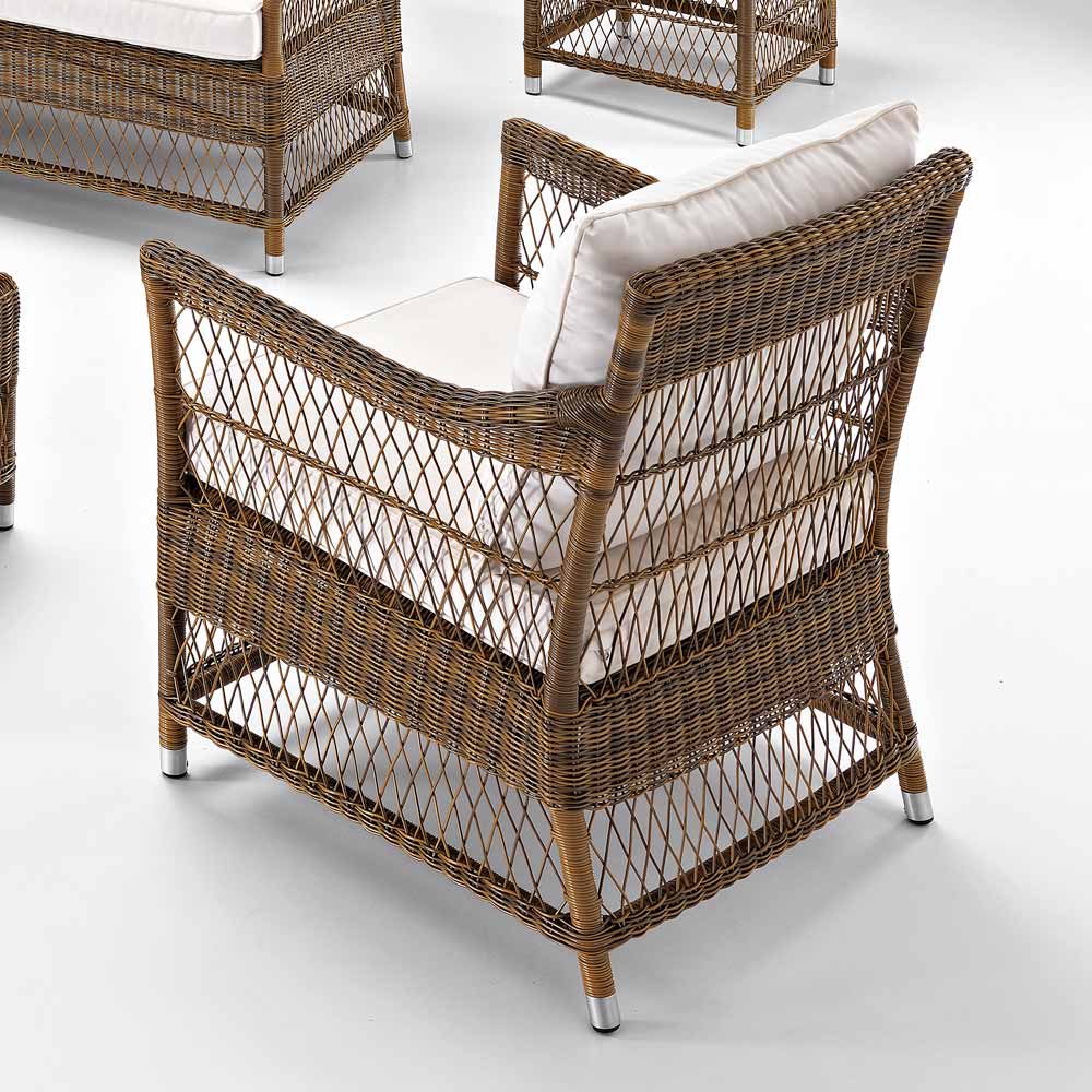 The weaving style is refined and delicate and together with the very high quality of the materials and its decisive shapes make this armchair perfect for furnishing interiors and exteriors, both private and contract environments such as terraces, verandas, gardens but they also find a perfect location by the pool.