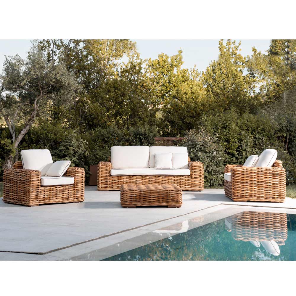Outdoor armchair made in natural hand-woven rattan in natural Jungle colour with cushions included in the standard "Ecru" finish and "chocolate" piping.