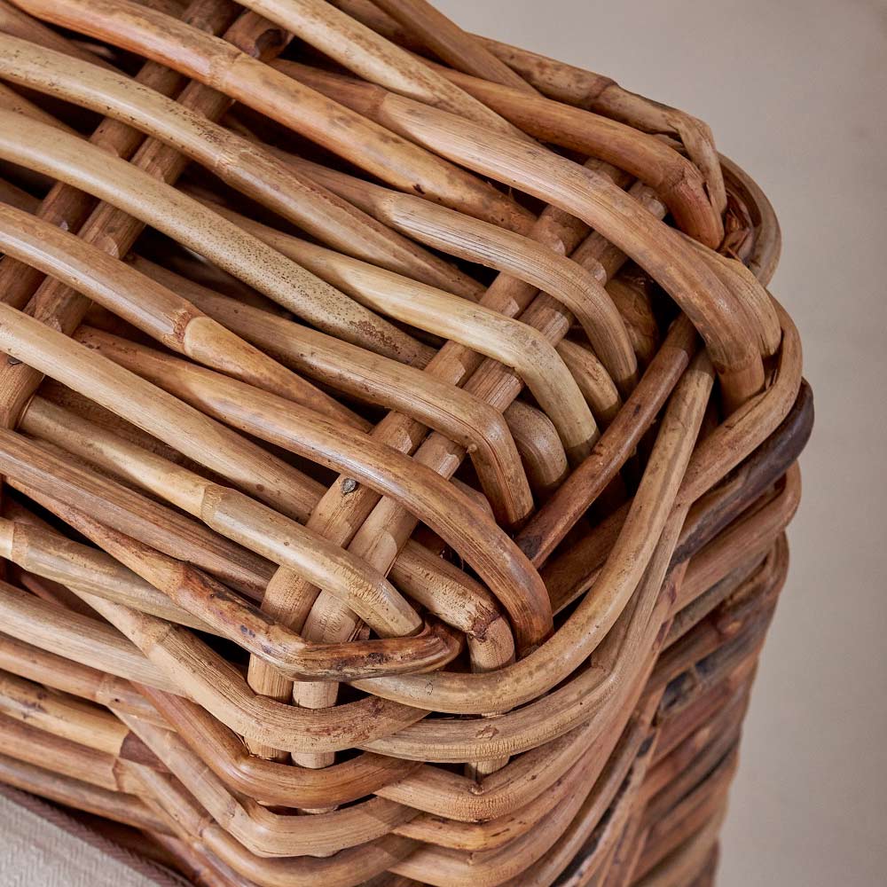 The armchair belongs to a whole collection which stands out for the square shape of the frames, covered with a rustic weave with a strong aesthetic impact. The manual processing and the use of a special type of natural Rattan with iridescent tones - which recalls the tones of autumn and the undergrowth - gives uniqueness to each piece. The products in this collection are suitable for furnishing sheltered outdoor spaces such as porches, balconies, terraces, verandas and gazebos, enlivening the environments with unique warmth and style.