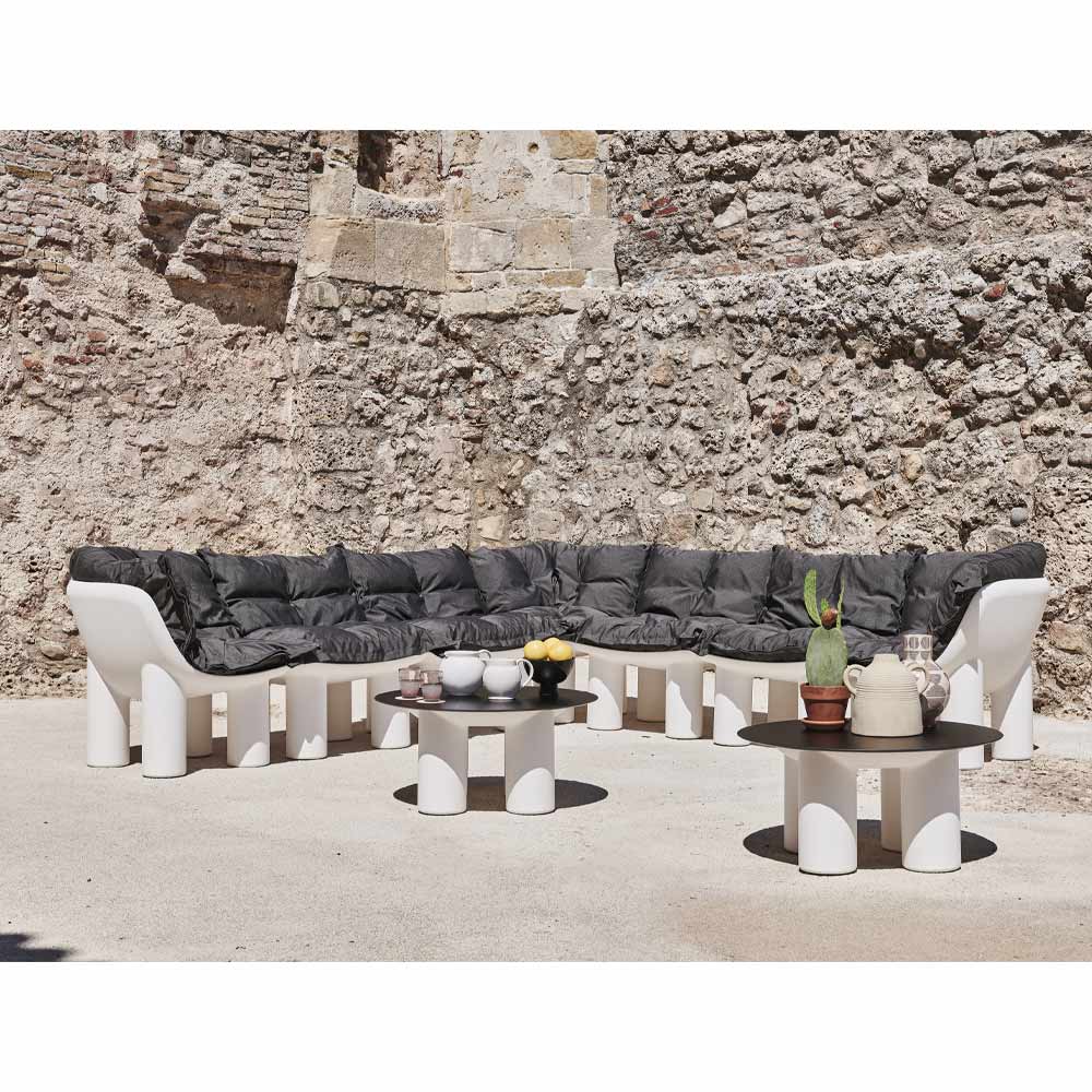 Outdoor armchair with matt finish polyethylene structure complete with padded seat cushion covered in Sunbrella fabric, made entirely in Italy. A piece of furniture with a modern and versatile aesthetic that is inspired by Greek-Roman architecture to give life to an idea with a strong but at the same time fresh and refined character, ideal for decorating any outdoor space with personality and a creative touch. The key element that characterizes the interior design are the legs that give solidity and sturdiness to the product as well as enriching the figure with originality. To underline the functional side is instead the soft cushion that ensures a comfortable and particularly welcoming seat for an optimal result.