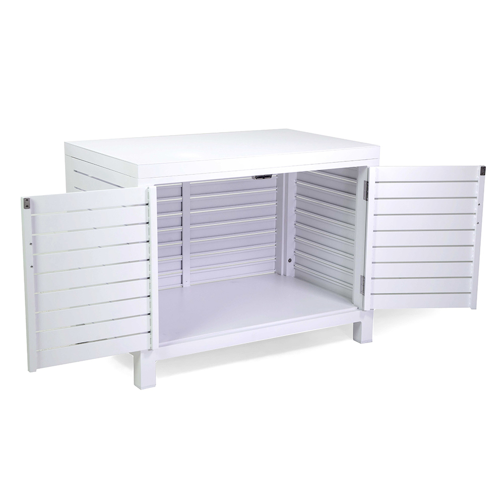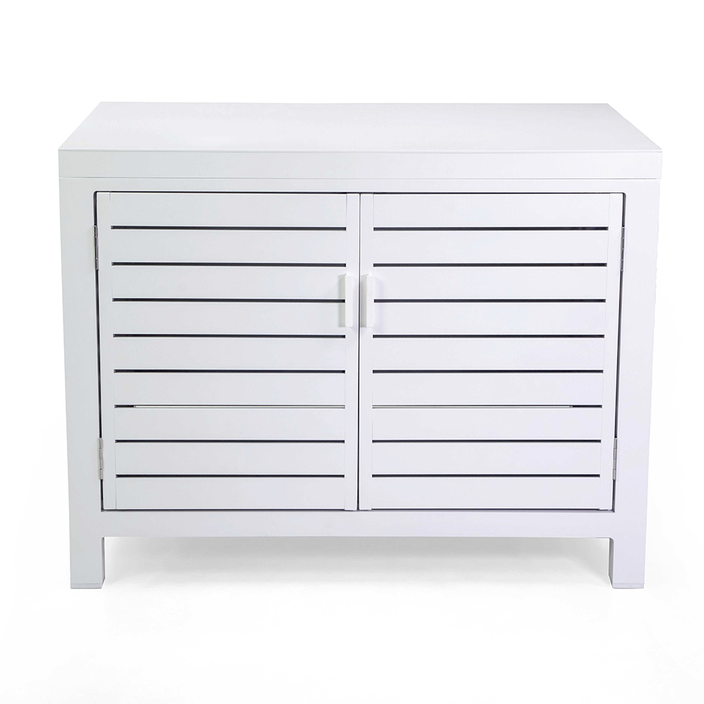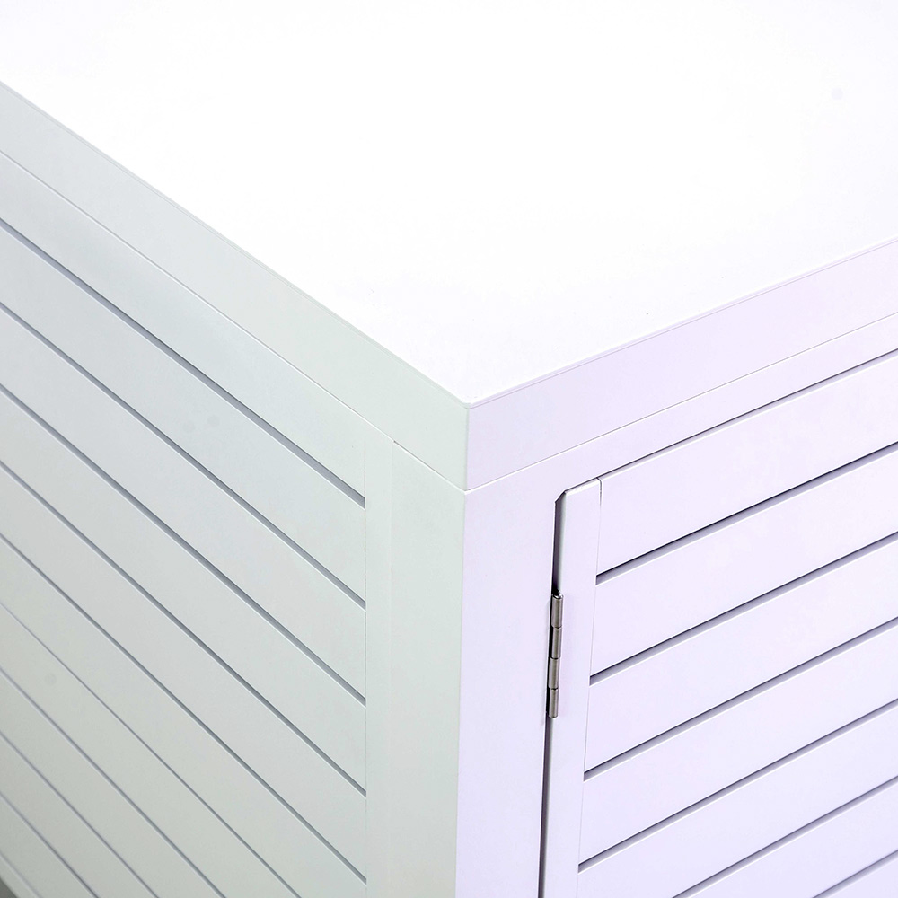 Add a touch of modern elegance to your outdoor space with this sophisticated aluminum cabinet , which will fit perfectly into any outdoor setting. The clean slatted design creates a visually appealing effect, making it a functional and decorative centerpiece.