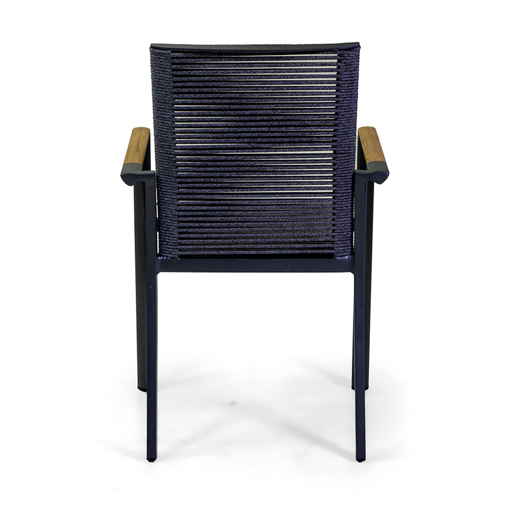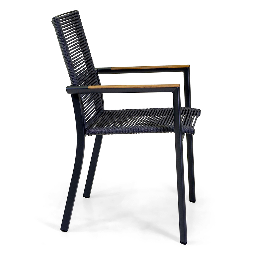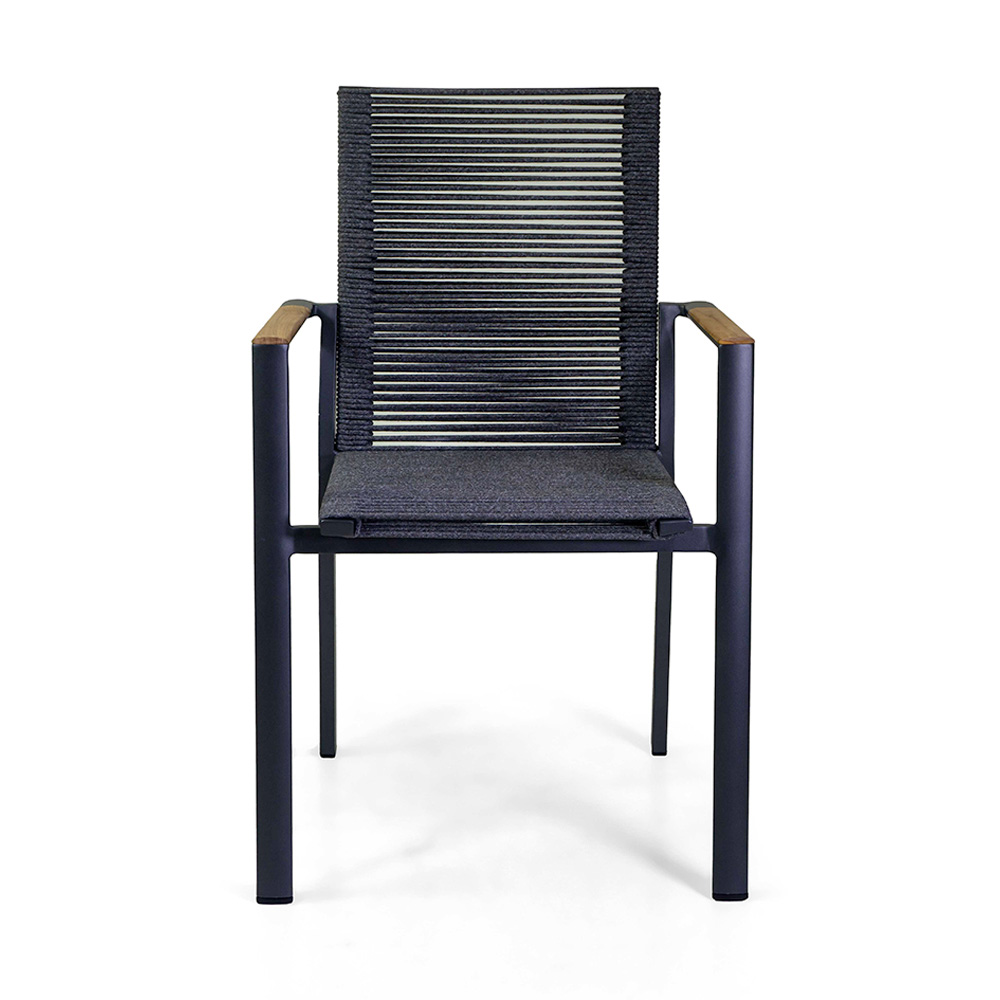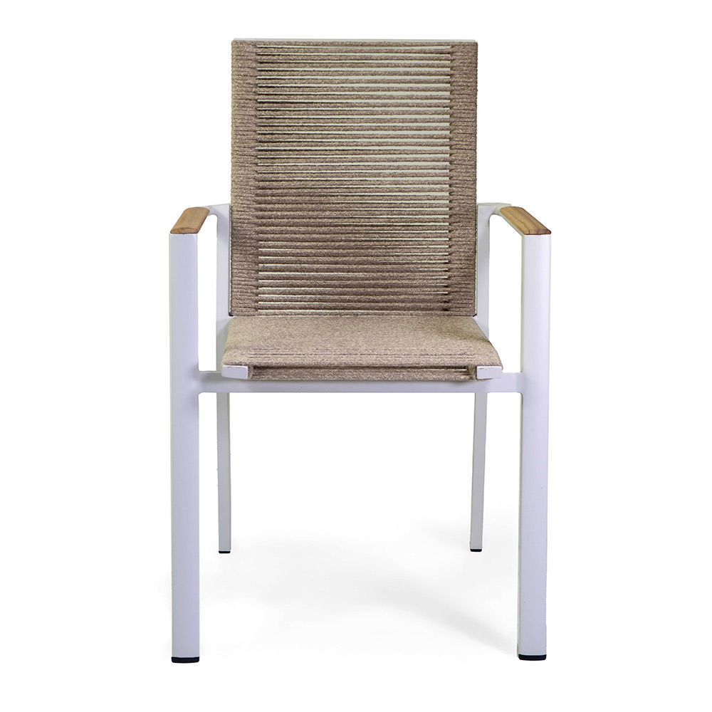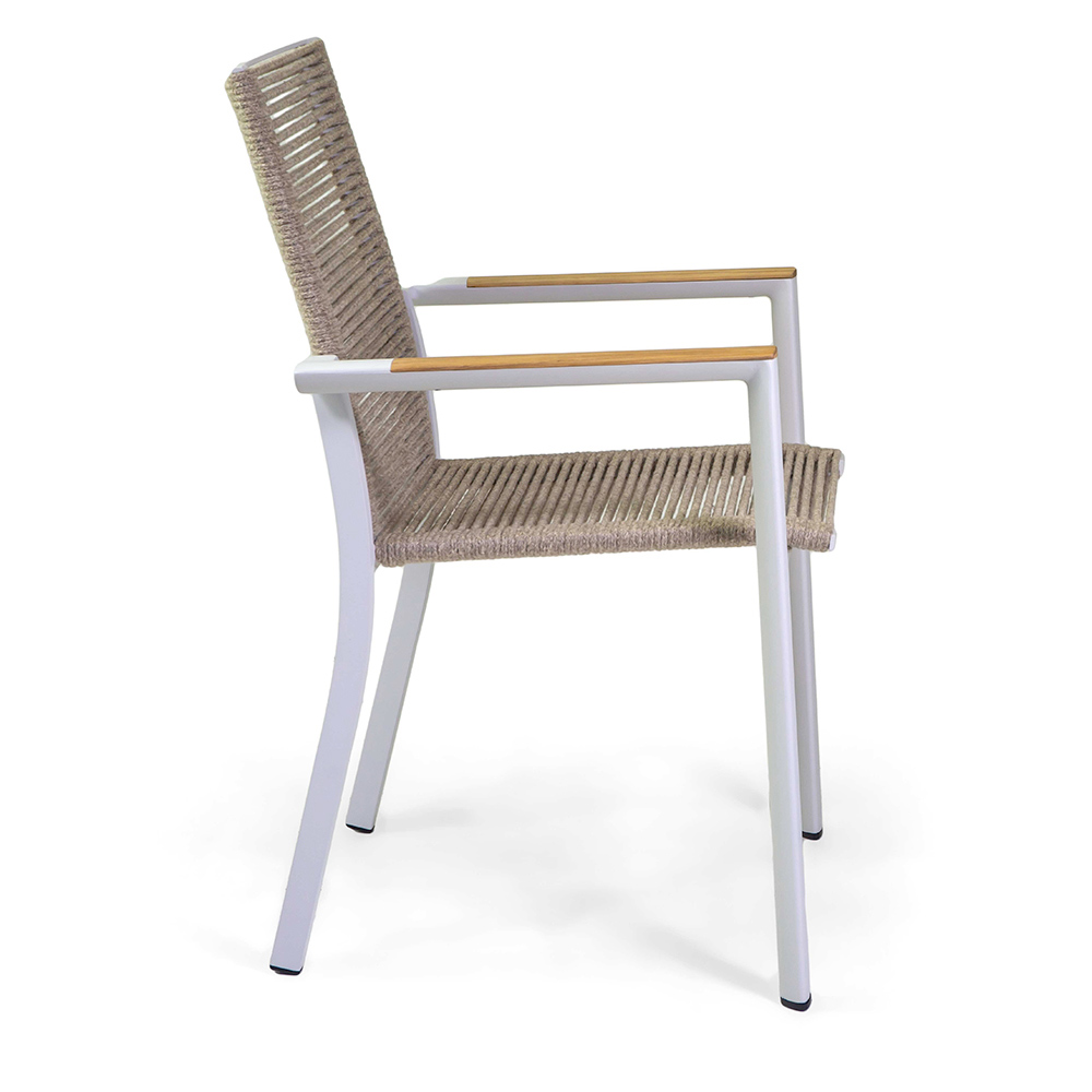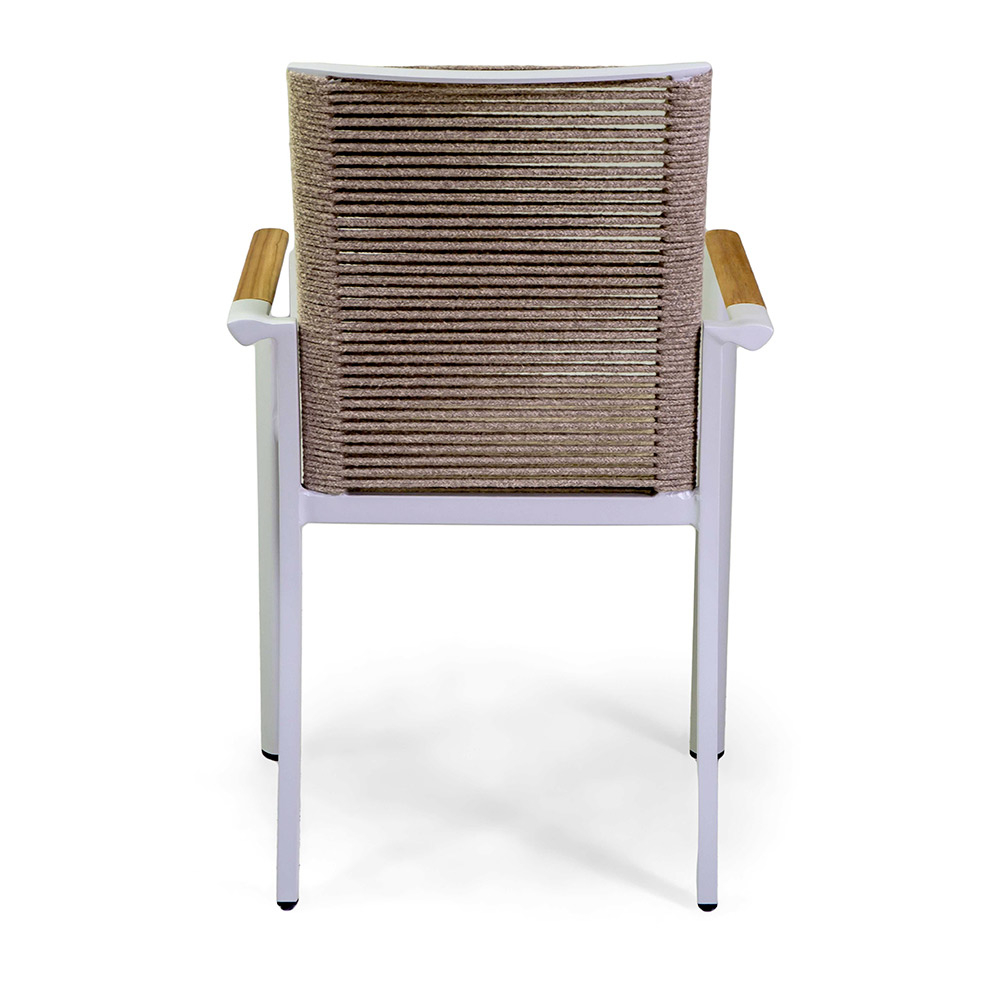 Discover the modern appeal and comfort of our outdoor chair . With a sleek, contemporary design, this chair combines the strength of powder-coated aluminum with the natural beauty of ropes. The wooden armrests add a touch of warmth and style.