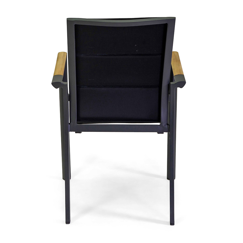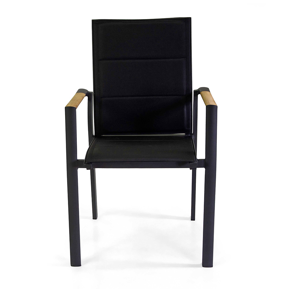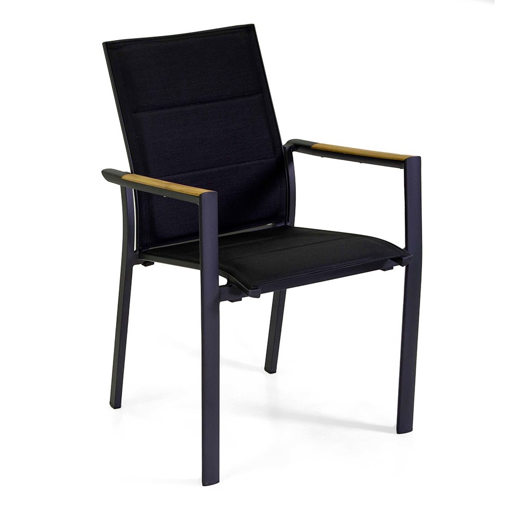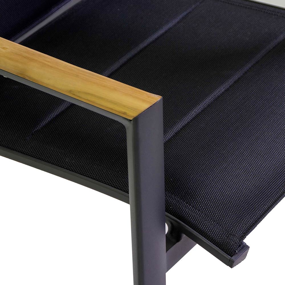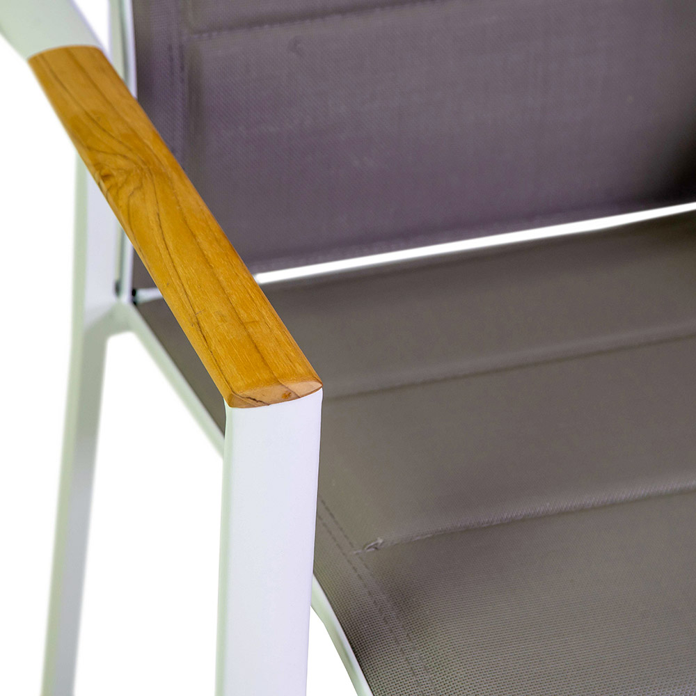 Outdoor chair made with aluminum frame with double layer textilene, internal padding in quick-drying cotton, armrests with TEAK wood inserts