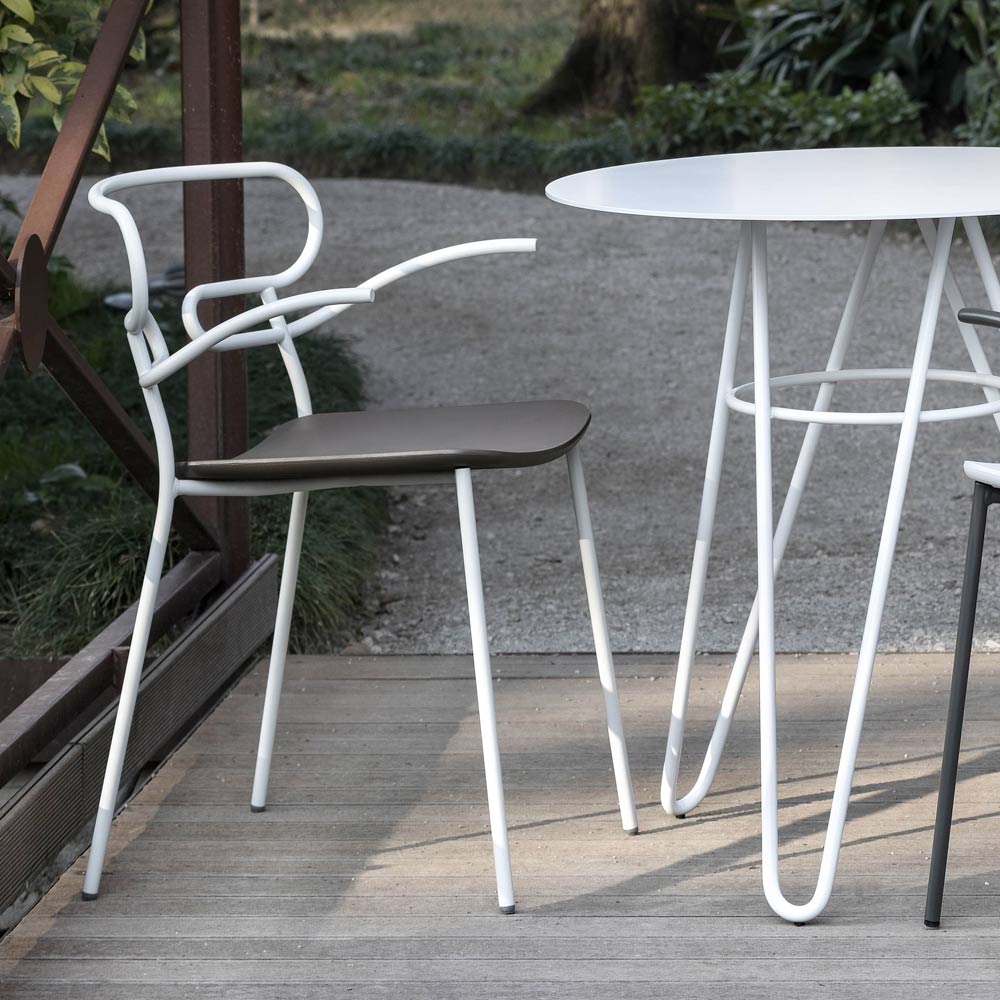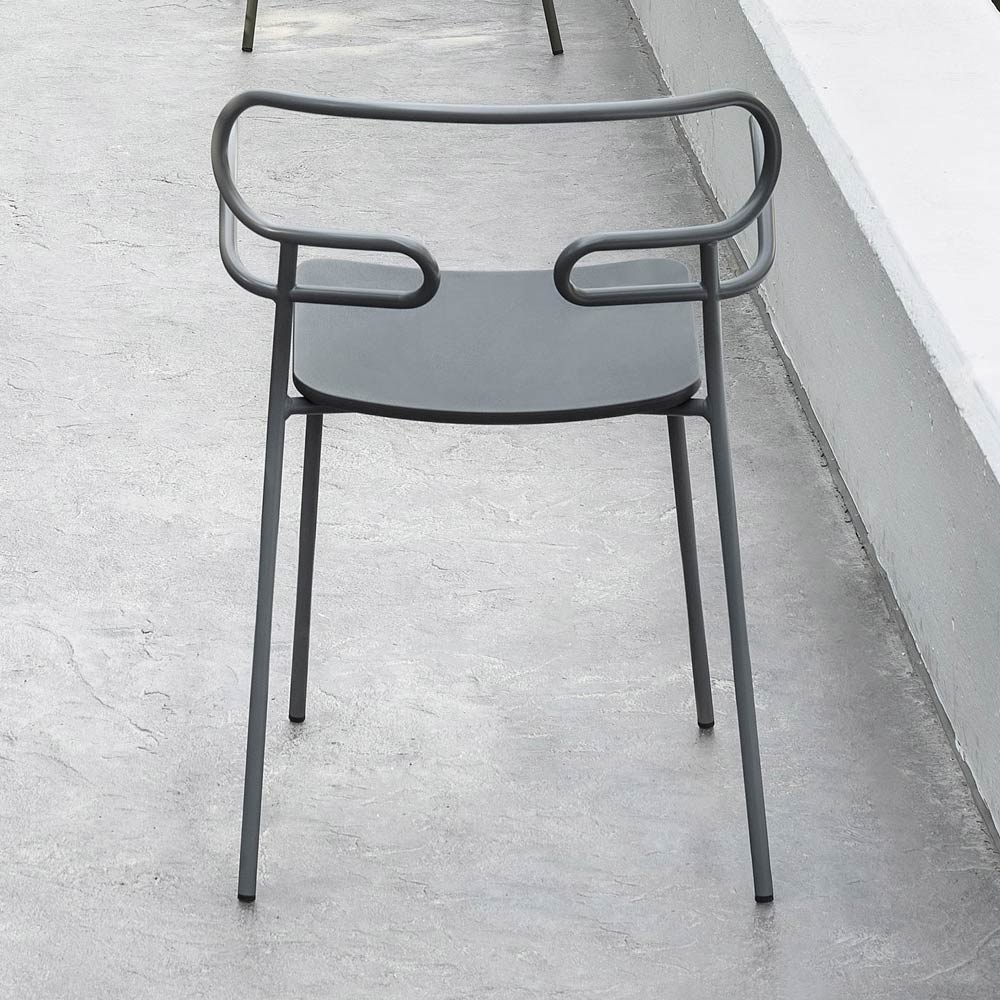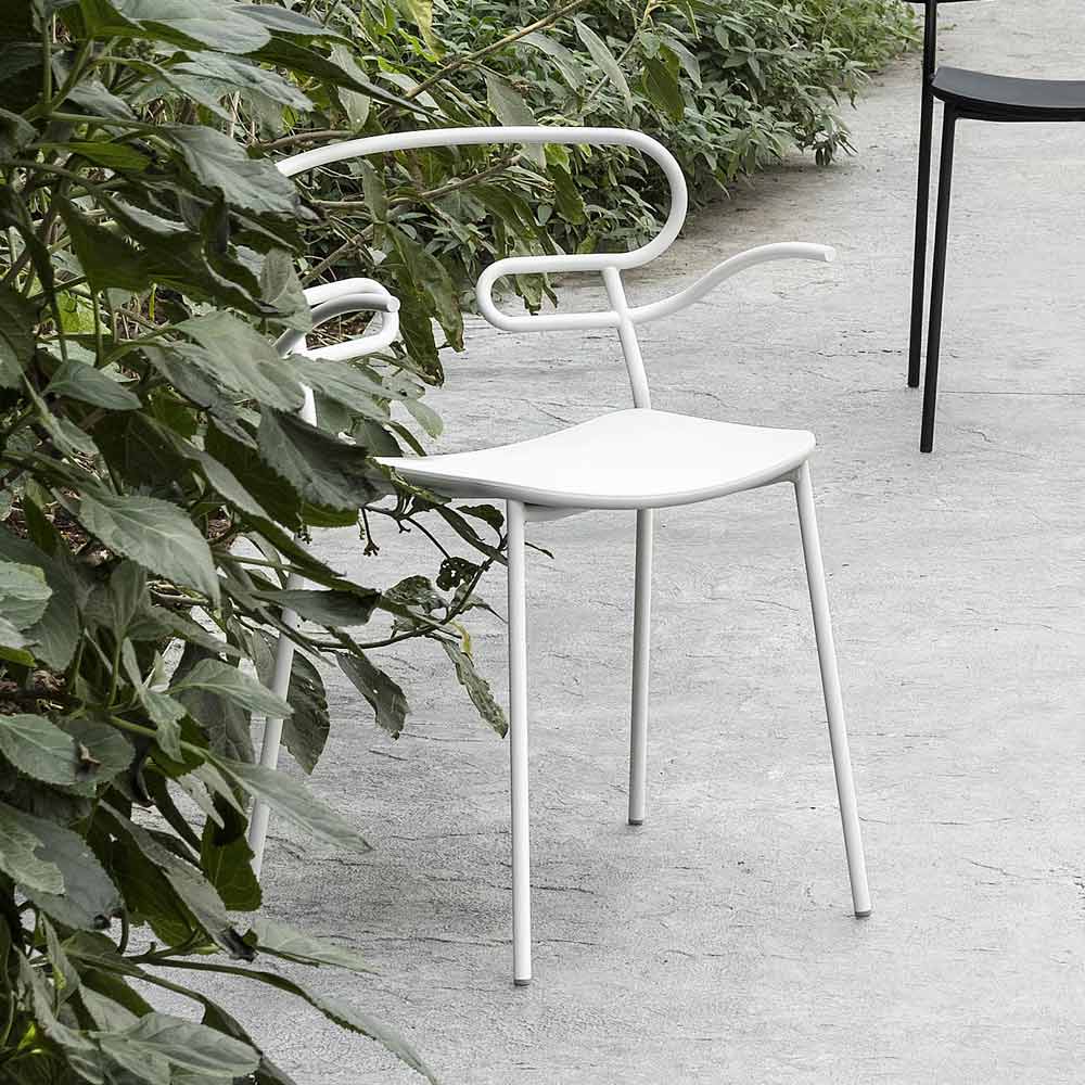 Outdoor chair made in Italy with painted metal structure and polyurethane seat. Simple and essential, this complement stands out thanks to its light lines and the particular shape of the backrest obtained through the curvature of a single metal tube, thus creating an unusual and avant-garde design. Ideal for decorating your outdoor areas with personality such as gardens, verandas and terraces, it has a particularly functional feature that is the possibility of stacking to obtain a practical and easily arranged solution by optimizing your spaces when the chairs are not used.