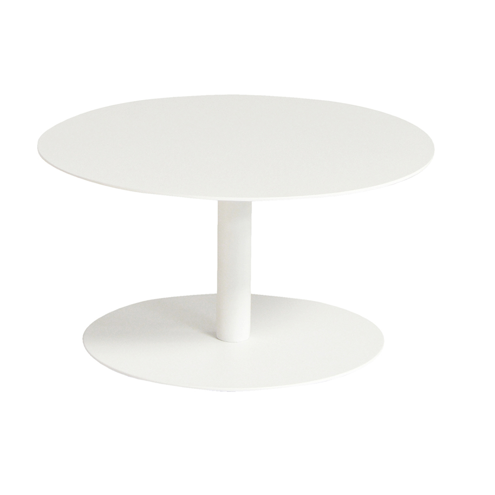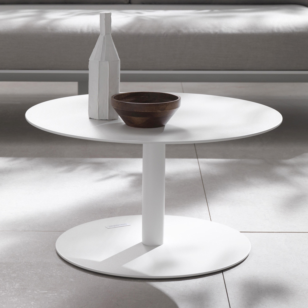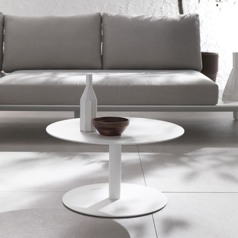 Side table for the garden made up of a top and structure in aluminum painted with epoxy powders in white. Ā Characterized by a soft, linear and simple design, this coffee table is perfect for furnishing any outdoor environment such as terraces, swimming pools and gardens, while at the same time finding its place in the various indoor living areas as a functional support point.