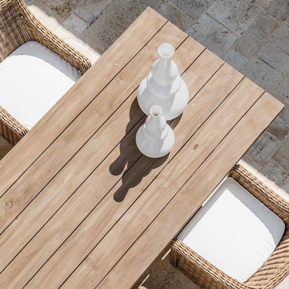 Garden dining table made with recycled teak wood entirely made in Italy. This table lends itself to any outdoor environment, from the living area, to the dining room and by the poolside thanks to the material used for its construction that is resistant to atmospheric agents. Its simple and linear finishes make the table an original idea for all those who want to furnish their outdoor space with taste and style, without sacrificing functionality and practicality.