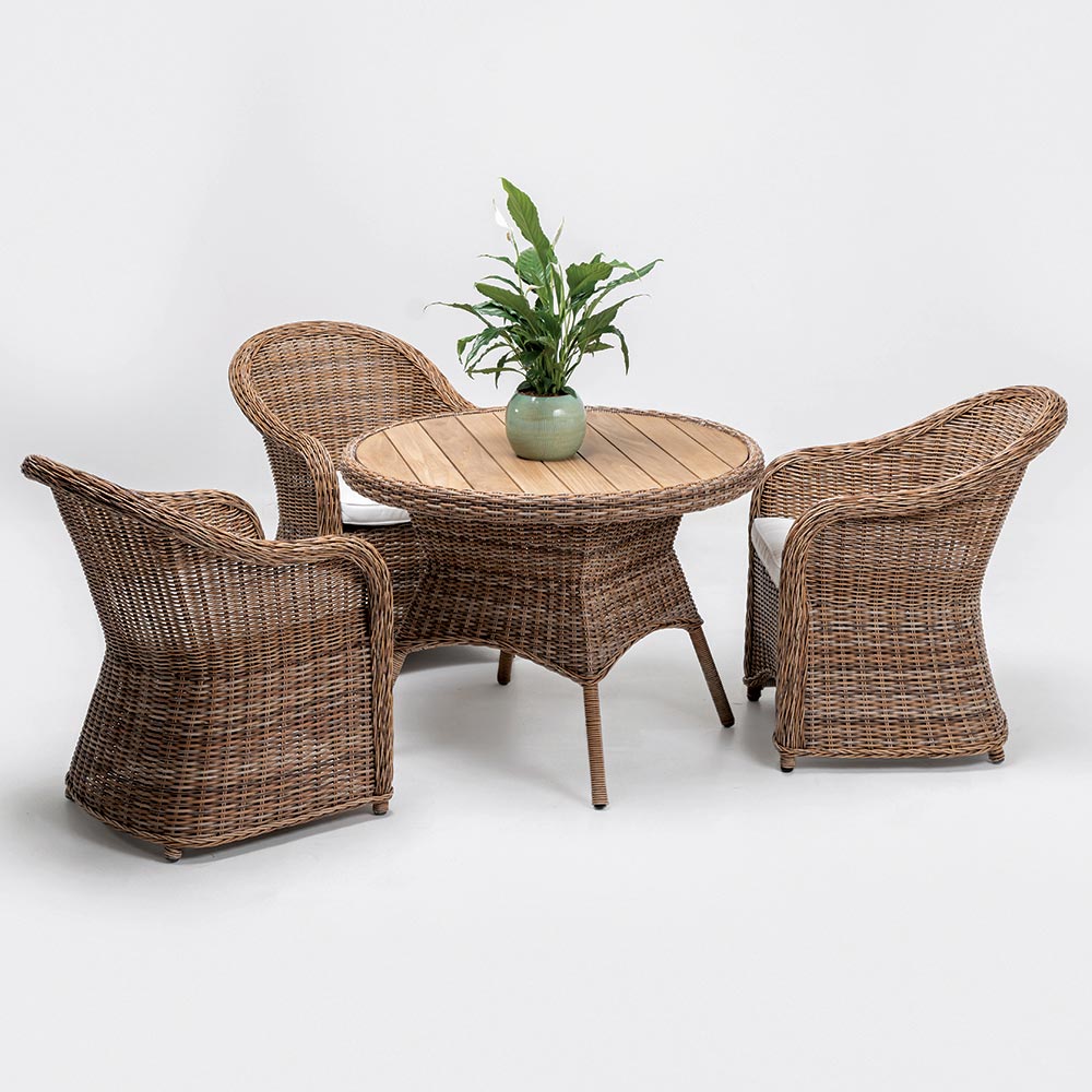 This garden table is a charming addition to any outdoor space. Its woven poly rattan frame is a testament to natural design, offering durability and a beauty that grows with age. The tabletop, made of natural teak slats, invites you to share moments of relaxation and conviviality outdoors.