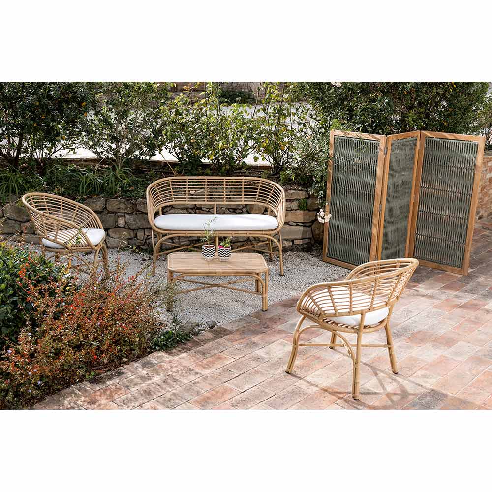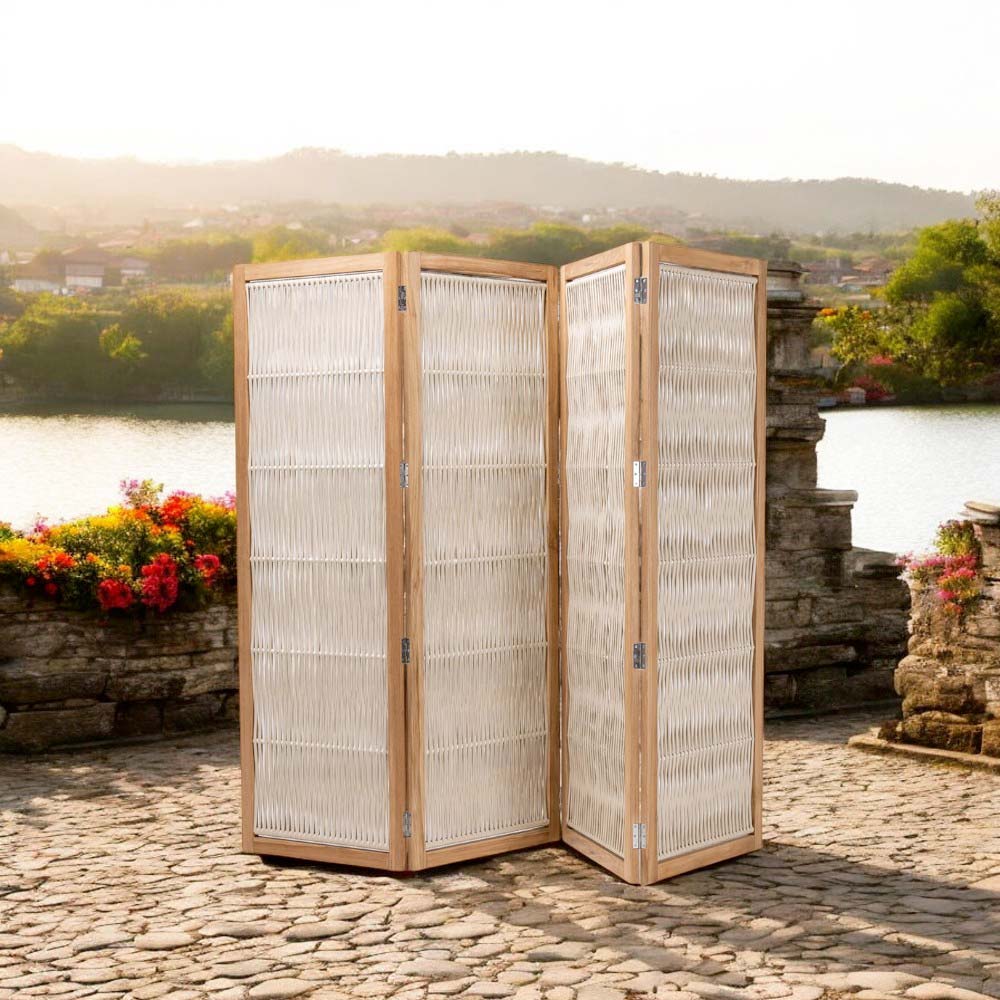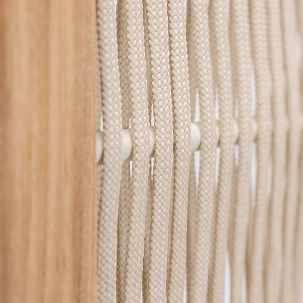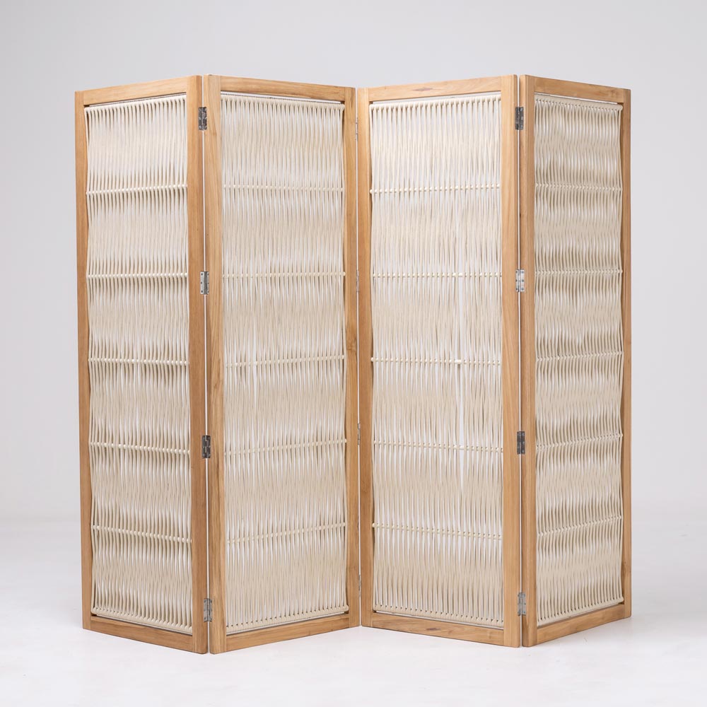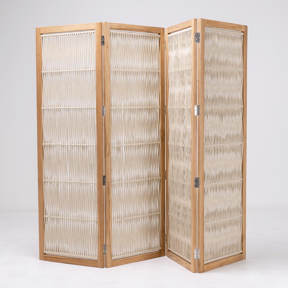 This garden divider represents an elegant design solution to define outdoor spaces , offering a combination of privacy and style. The teak and aluminum structure merges with woven rope panels, combining the warmth of the organic material with the functionality of a mobile partition.