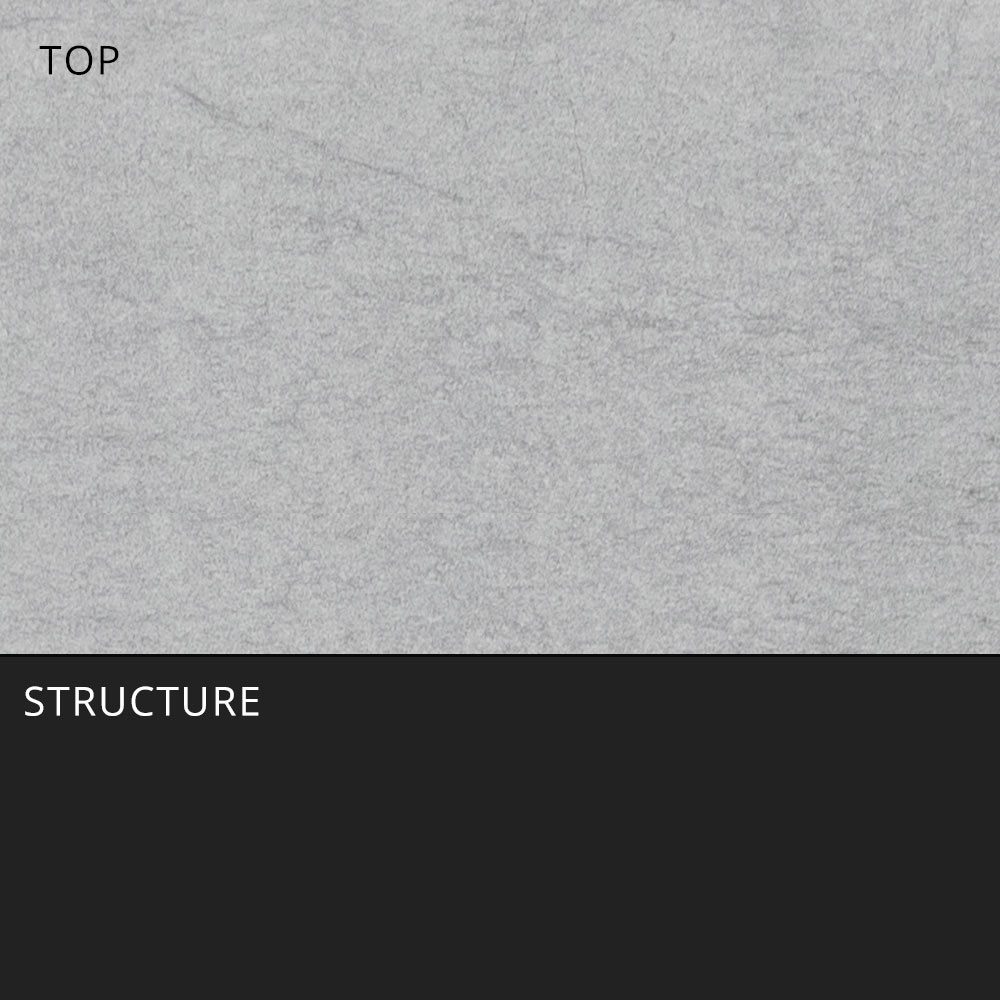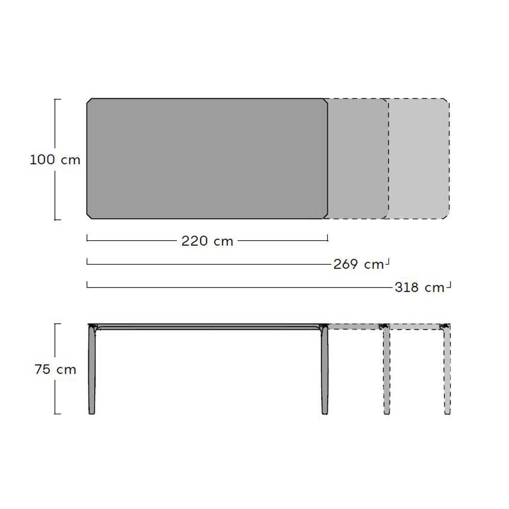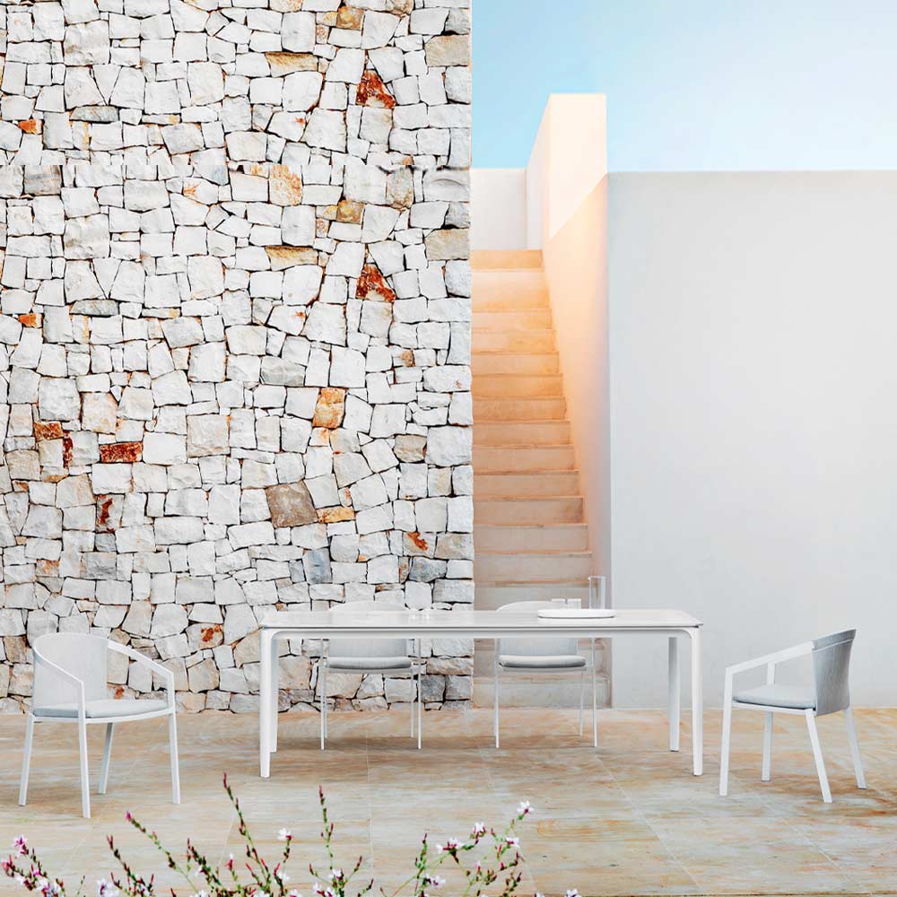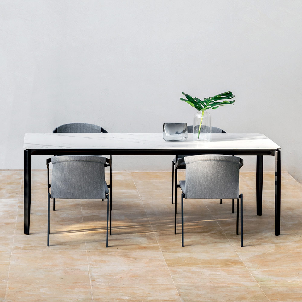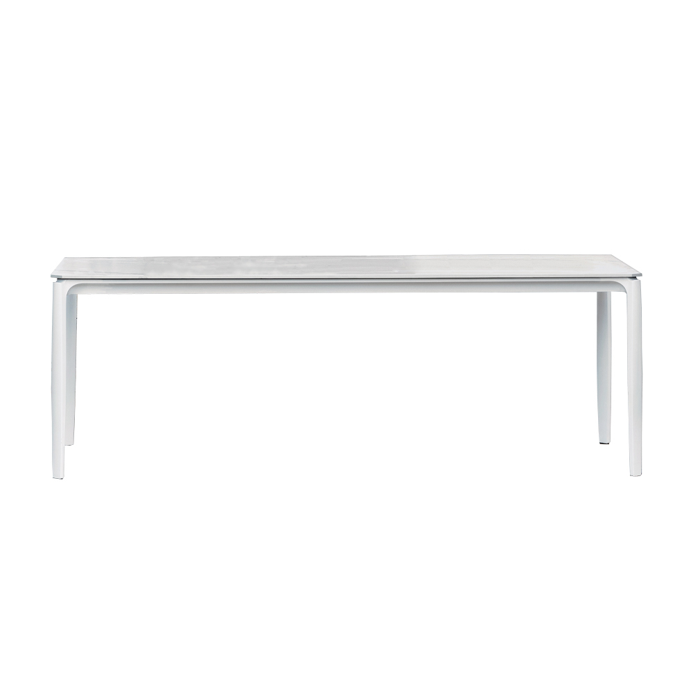 The structure is made of epoxy powder coated aluminum, combined with the rectangular top in 12 mm thick stoneware with extensions included.