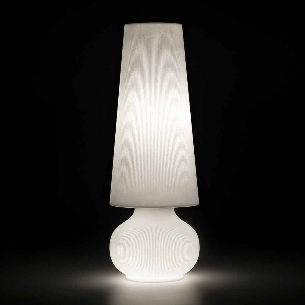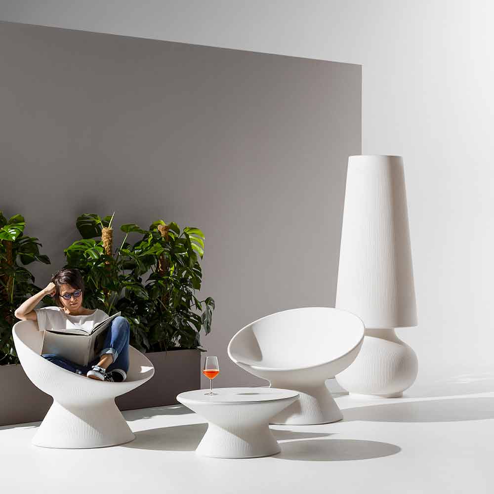 Floor lamp for furnishing outdoor spaces made in Italy in white polyethylene. Characterized by an elegant and modern design, this lamp with a sculptural presence is a perfect furnishing solution for outdoor environments such as gardens and terraces or contract spaces where it is necessary to enrich the aesthetics with an innovative and original touch.