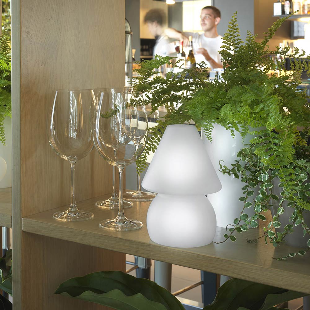 Outdoor lamp made in Italy in pearl polyethylene with integrated RGB LED equipped with rechargeable batteries and remote control, perfect for lighting evenings in outdoor environments and creating a romantic atmosphere if placed in an indoor space. Designed for those who chase the desire to embellish the outdoor spaces of their home with an innovative touch, this table lamp will transform your evenings with a touch of magic into real relaxing experiences.