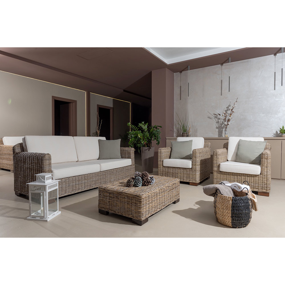 The living room belongs to a whole collection characterized by the natural gray kubu with straight lines and a wide seat. Kubu is a natural material among the most resistant among those that can be found in nature, but which always remains very light . Comfort and essentiality in a timeless style that takes shape thanks to the use of natural fibers that nature provides.