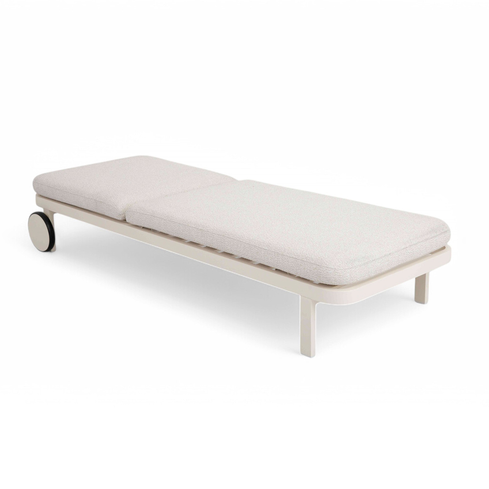 The minimalist design is enriched by thoughtful details, such as the integrated wheels that make it easy to move it wherever you prefer, following your moments of relaxation in the sun or shade. The padded mattress , covered in weather-resistant fabric , guarantees extraordinary comfort and durability over time.