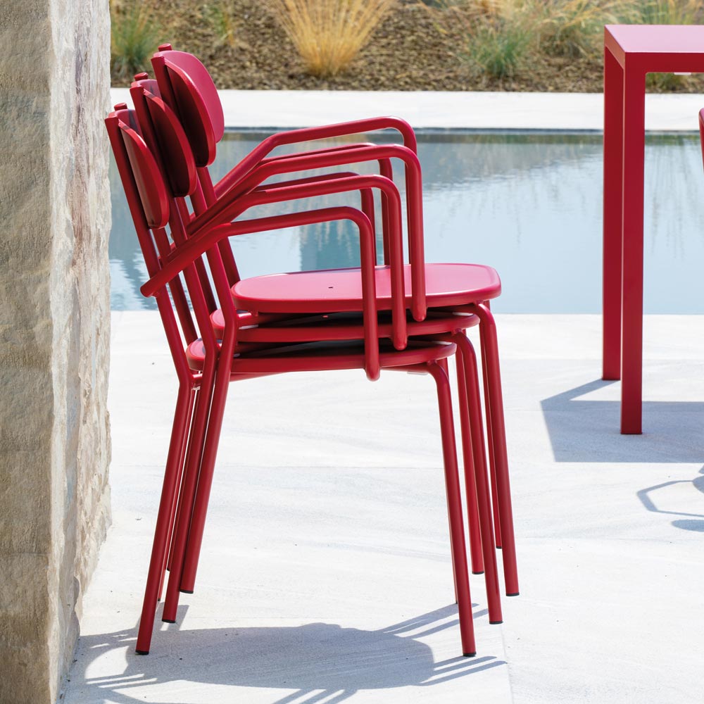 Stackable outdoor armchair entirely made in Italy in recyclable powder-coated galvanized iron, galvanized and painted, complete with practical and comfortable armrests . A furnishing accessory for outdoor spaces that combines design and practicality . Its simple and particularly modern shapes, the bold and bright colors that give vivacity to the context and the functionality brought to the highest levels make this chair a perfect solution for furnishing any environment, both domestic and contract.